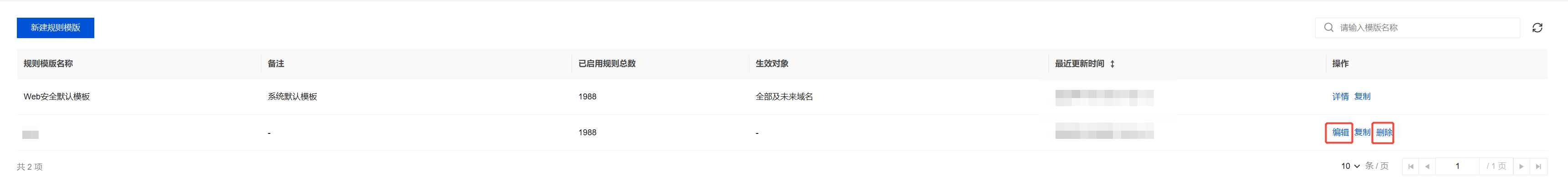 在 Web 安全页面,支持通过模板名称进行查询,操作列对应位置可编辑或删除规则。