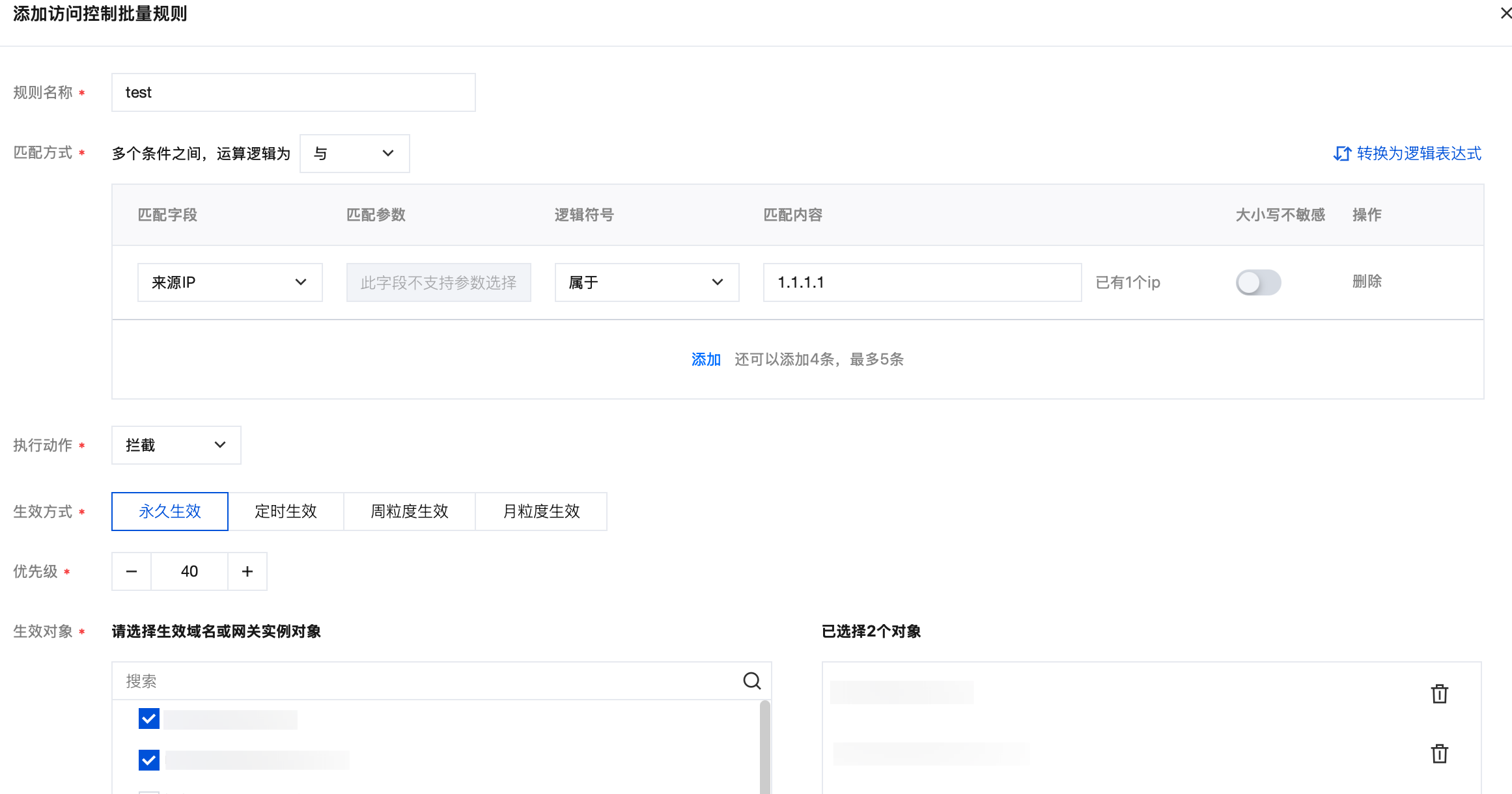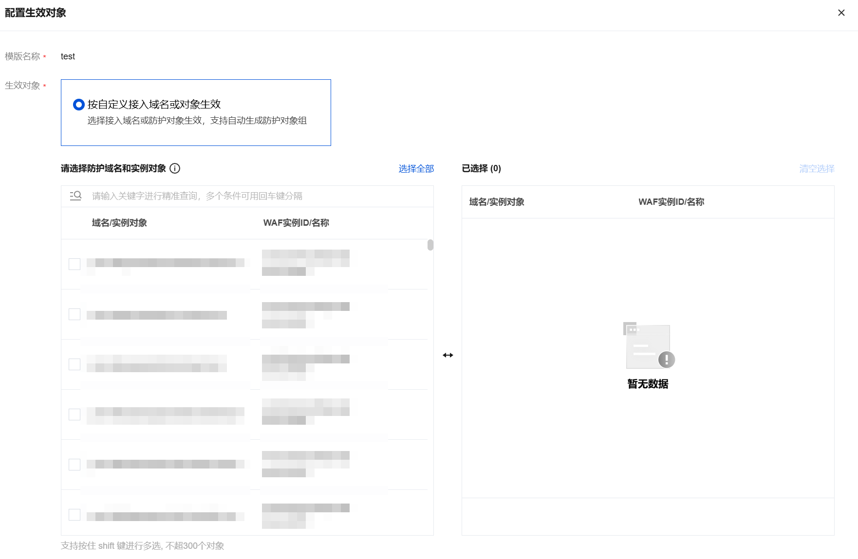 生效对象:选择生效域名或网关实例对象,支持全选,但不超过300个对象。