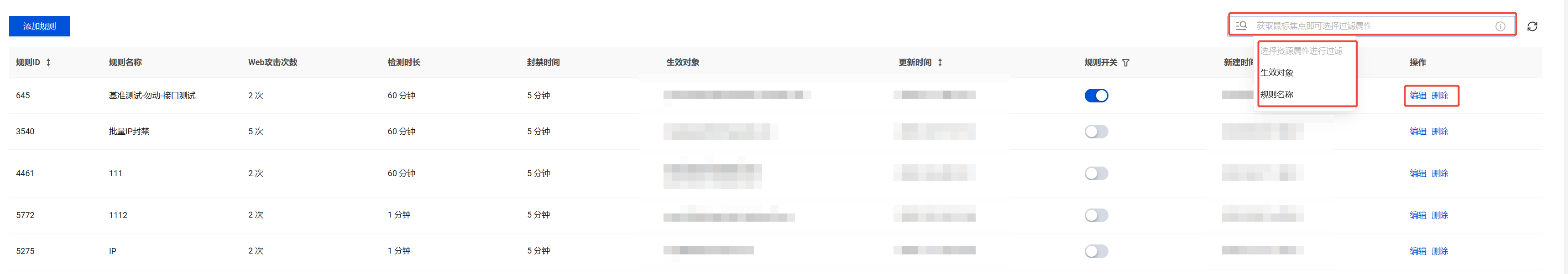 在 IP 封禁页面,支持选择多种资源属性进行查询,操作列对应位置可编辑或删除规则。