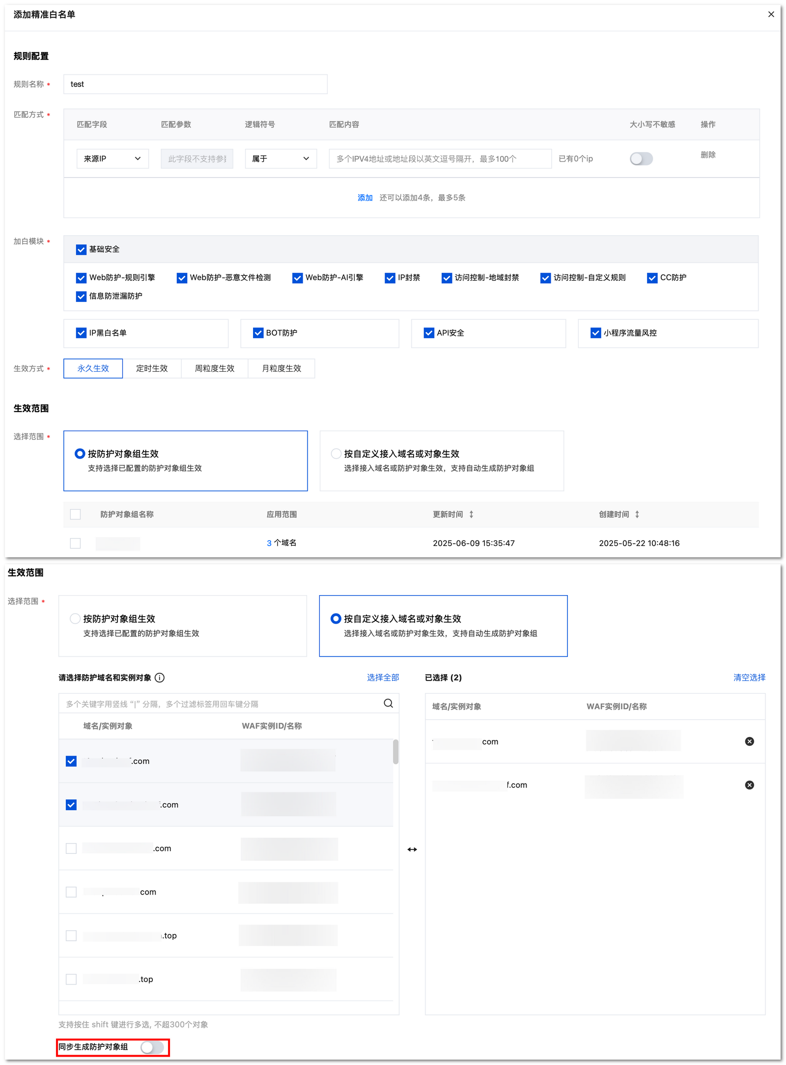 按自定义域名或对象生效:支持根据域名、实例属性进行筛选,按住 Shift 键可多选(最多300个对象)。选定接入域名或对象后,可一键同步生成防护对象组。