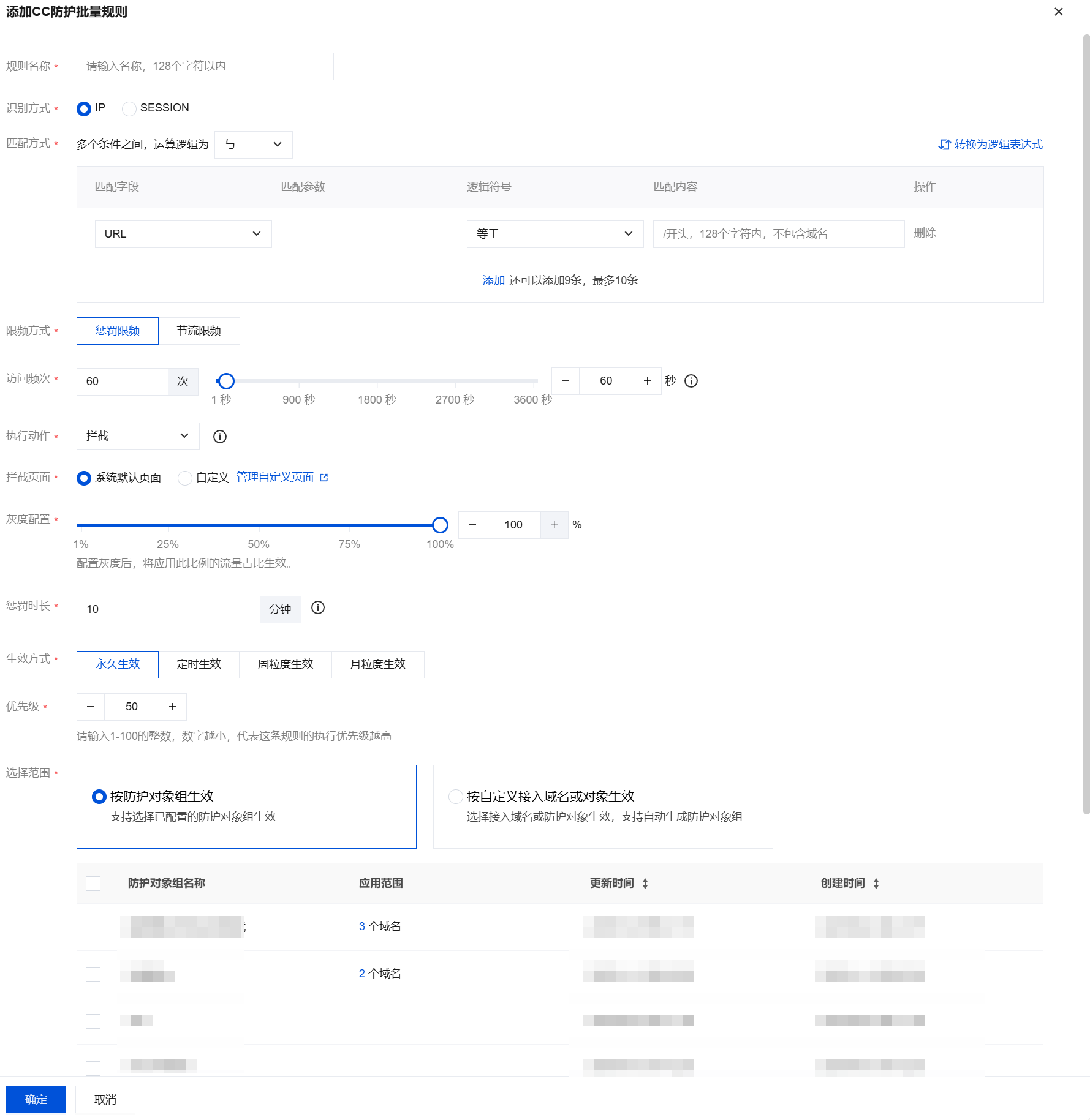 3. 在CC 防护页面,单击添加规则,配置相关参数,单击确定。