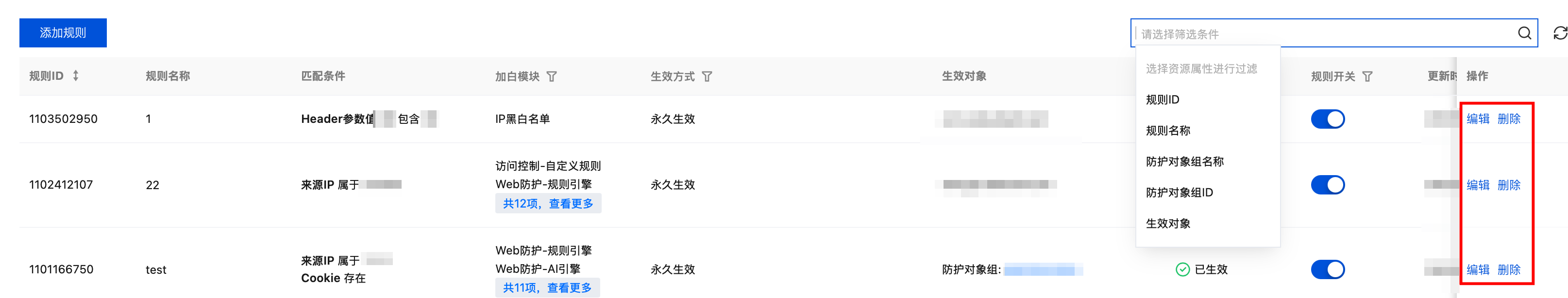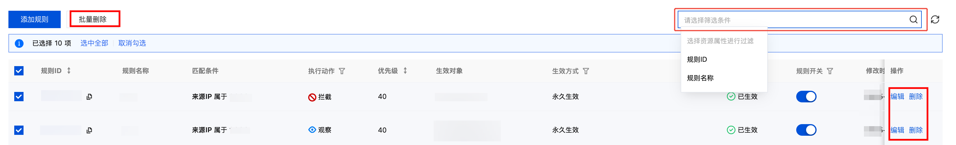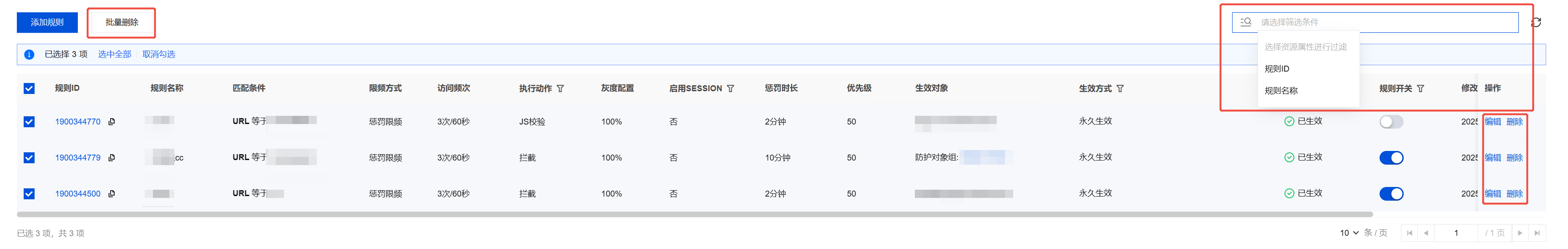 在 CC 防护页面,支持选择多种资源属性进行查询,操作列对应位置可编辑或删除规则,且支持批量删除规则。