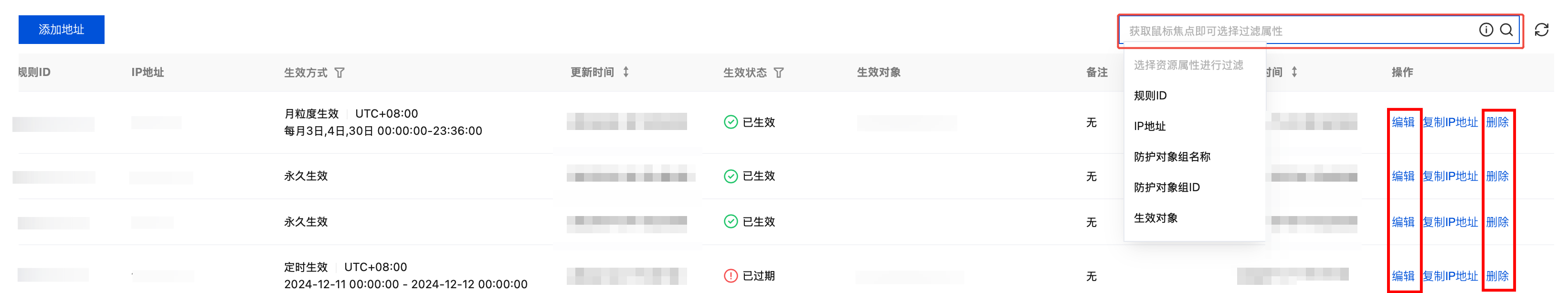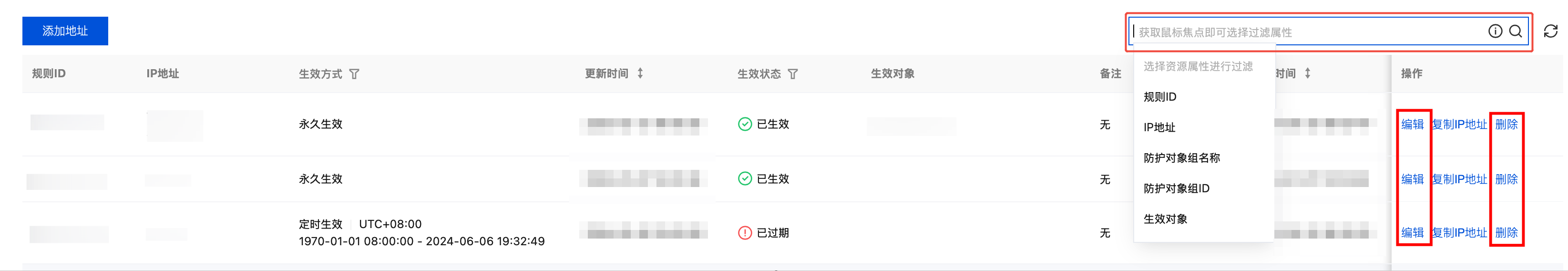 在 IP 黑名单页面,支持选择多种资源属性进行查询,操作列对应位置可编辑或删除规则。