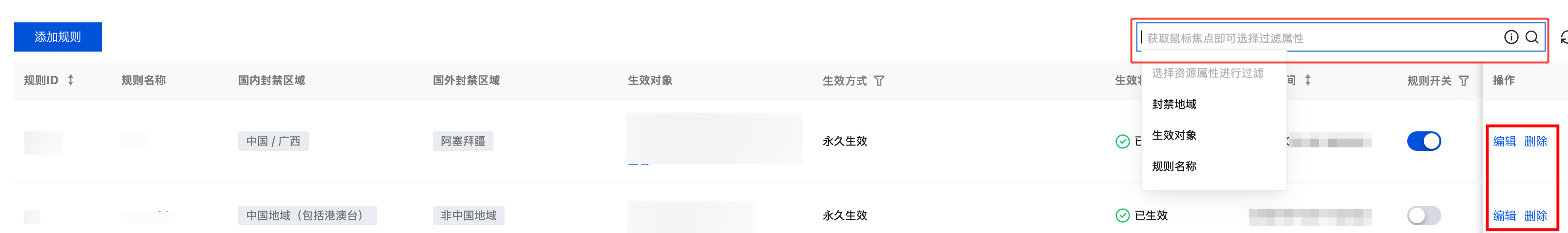 在地域封禁页面,支持选择多种资源属性进行查询,操作列对应位置可编辑或删除规则。