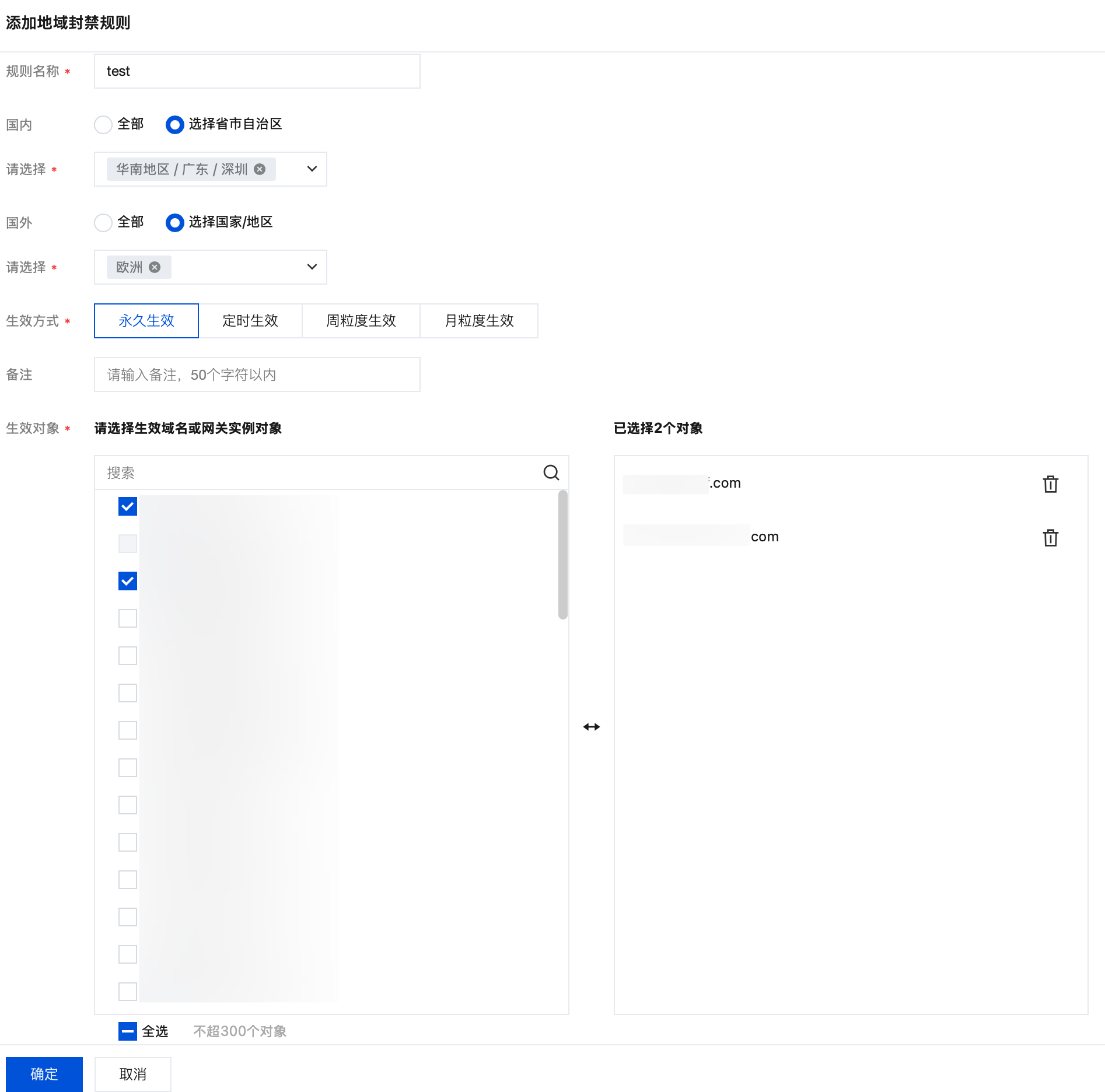 封禁地域:选择国内/国外封禁地区,支持的封禁地区详情请参见 地域封禁。