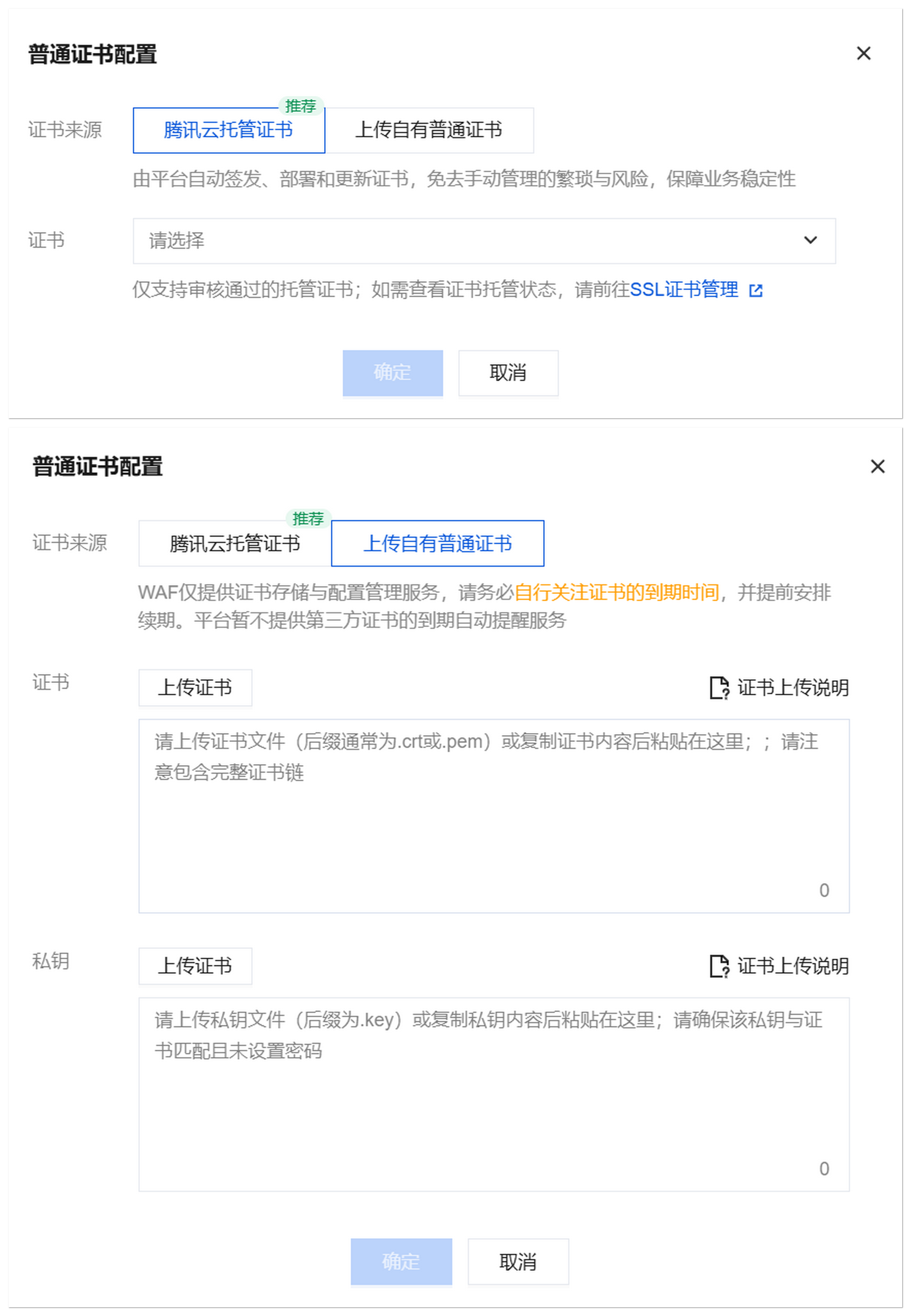 上传自有普通证书:支持直接粘贴证书内容或上传证书文件。上传前需准备 PEM 编码格式的证书文件和私钥文件。