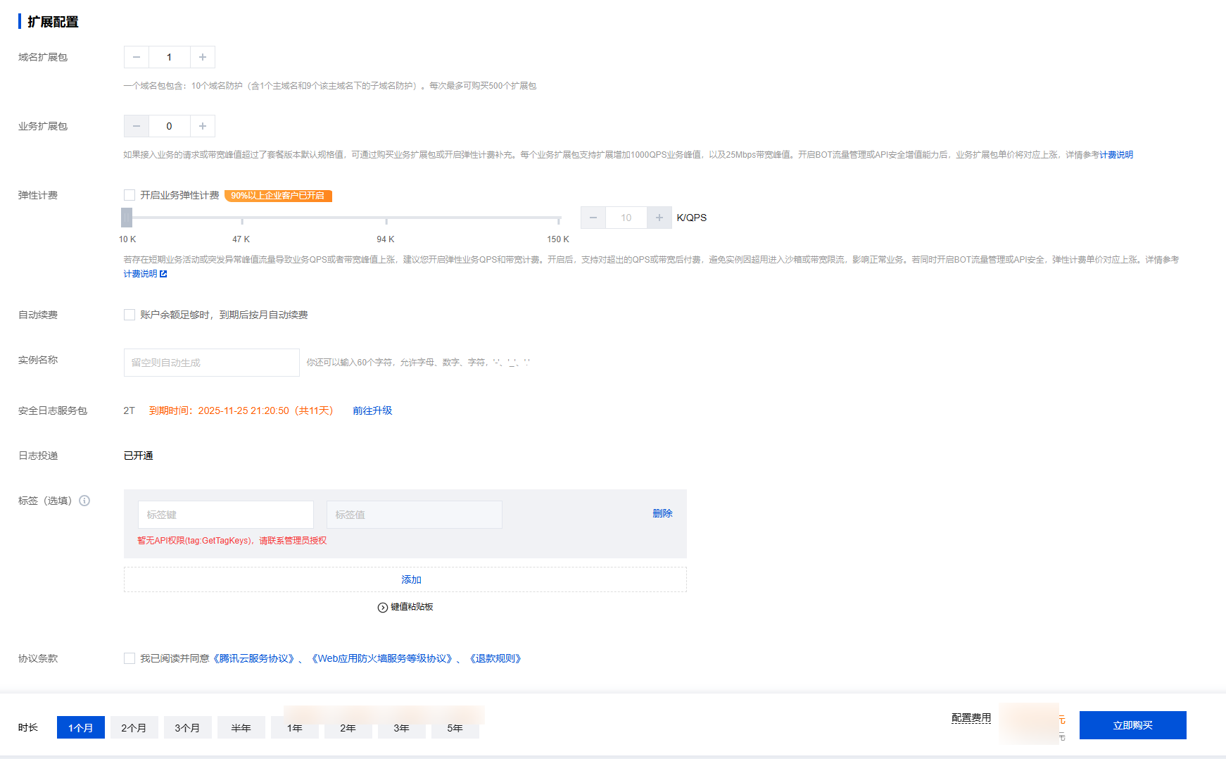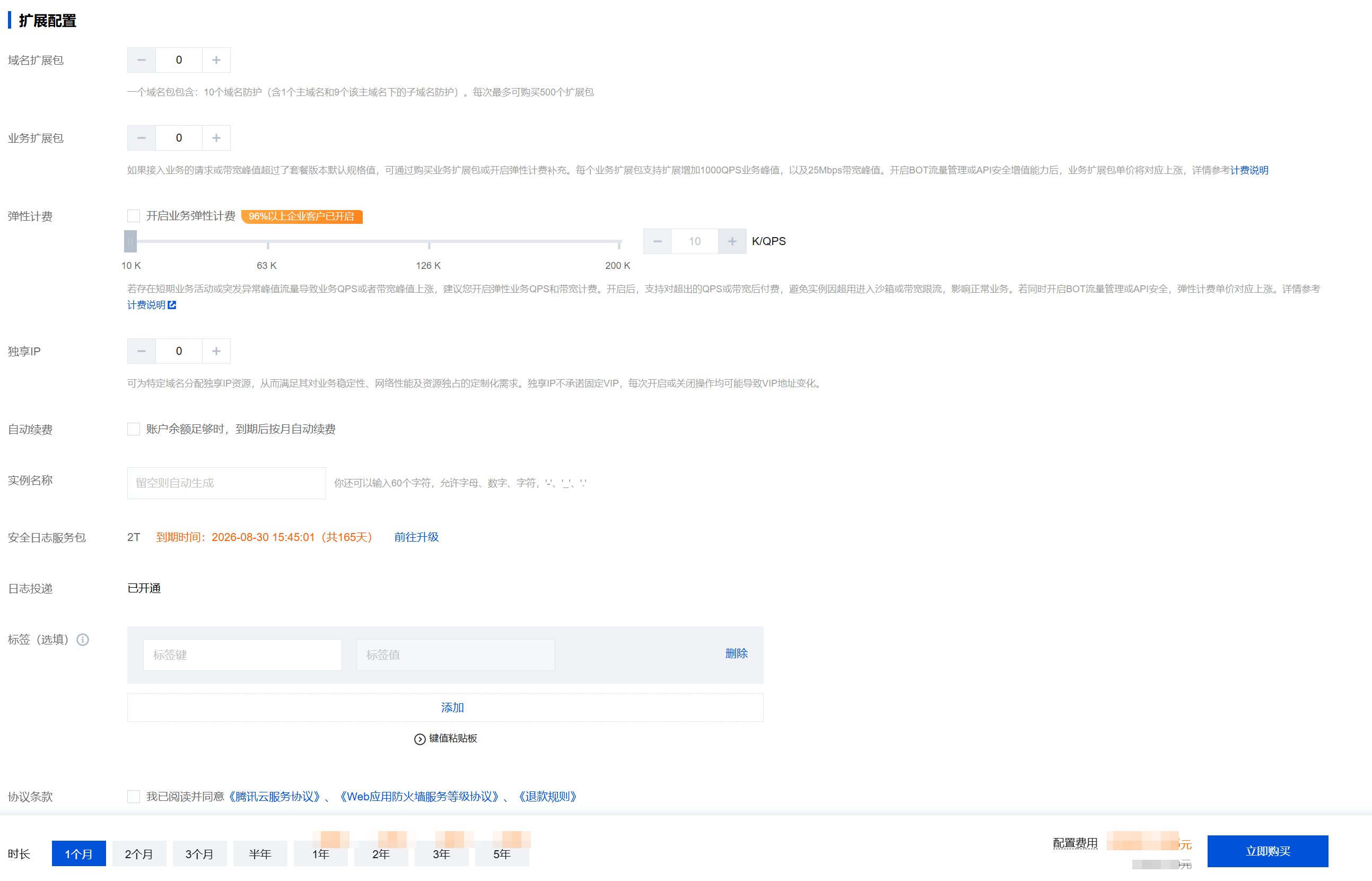 4. 配置完成后,单击立即购买,支付费用后,即可完成增值配置或扩展配置购买。