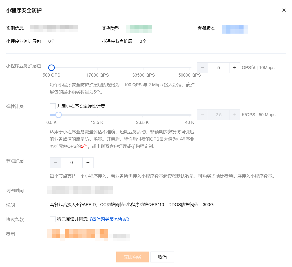 以小程序安全防护为例,若您未在购买 WAF 实例时选择小程序安全防护,可按需购买此增值配置,API 安全、BOT 流量管理等增值配置购买方式同理: