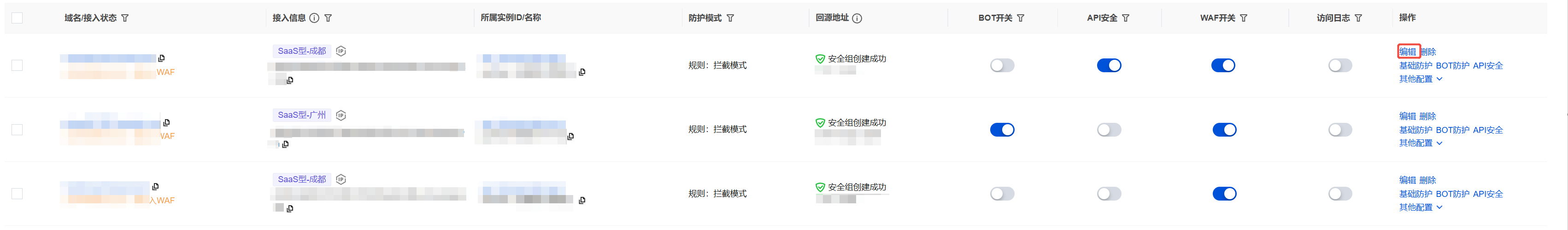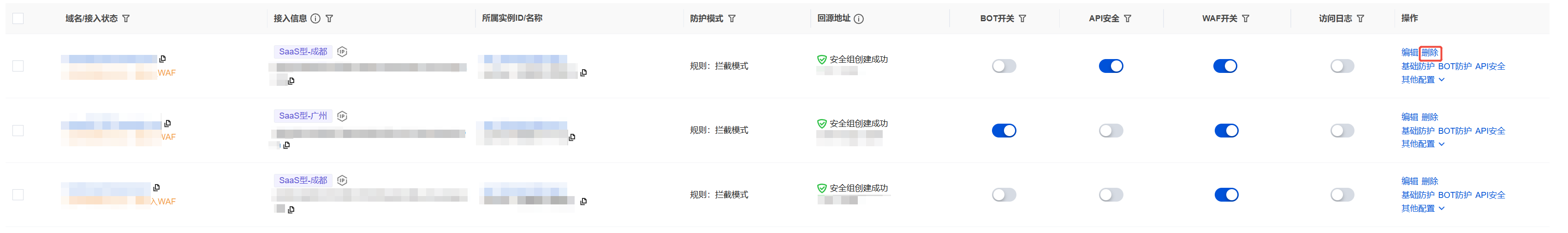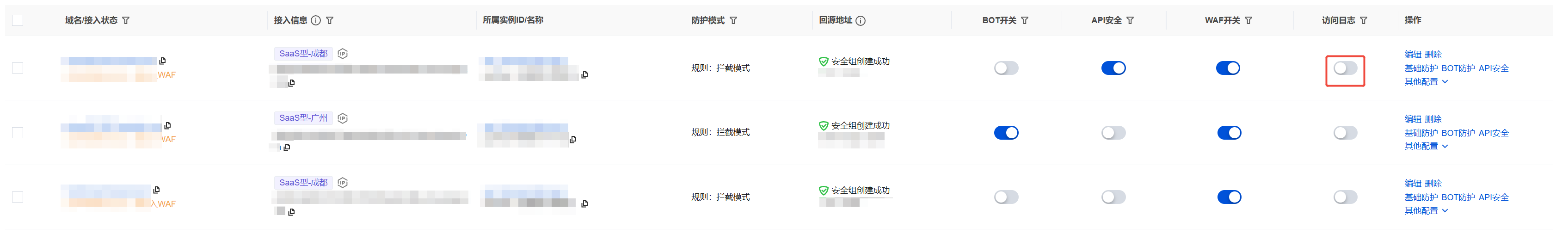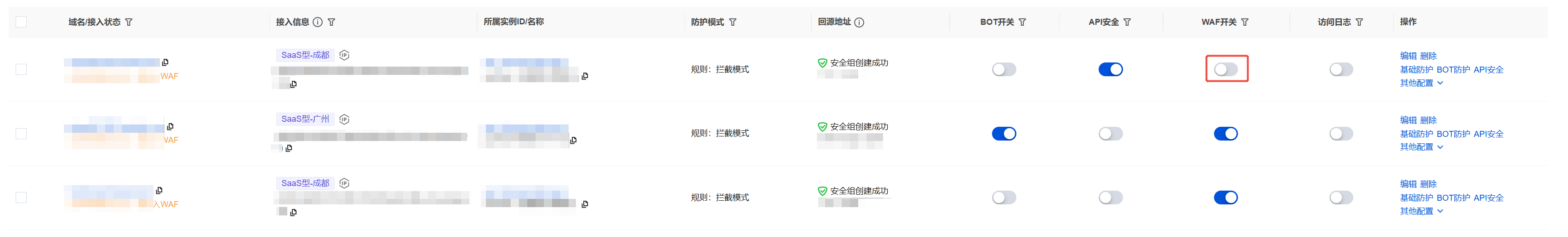 1. 在域名列表页面,单击 WAF 开关下的