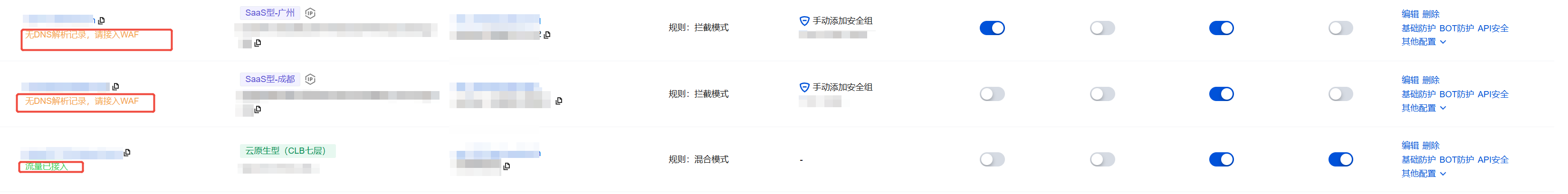 尚无流量接入 | 若配置下发成功,未开启 WAF 开关,此时流量还未接入 WAF。 | 开启 WAF 开关。 |