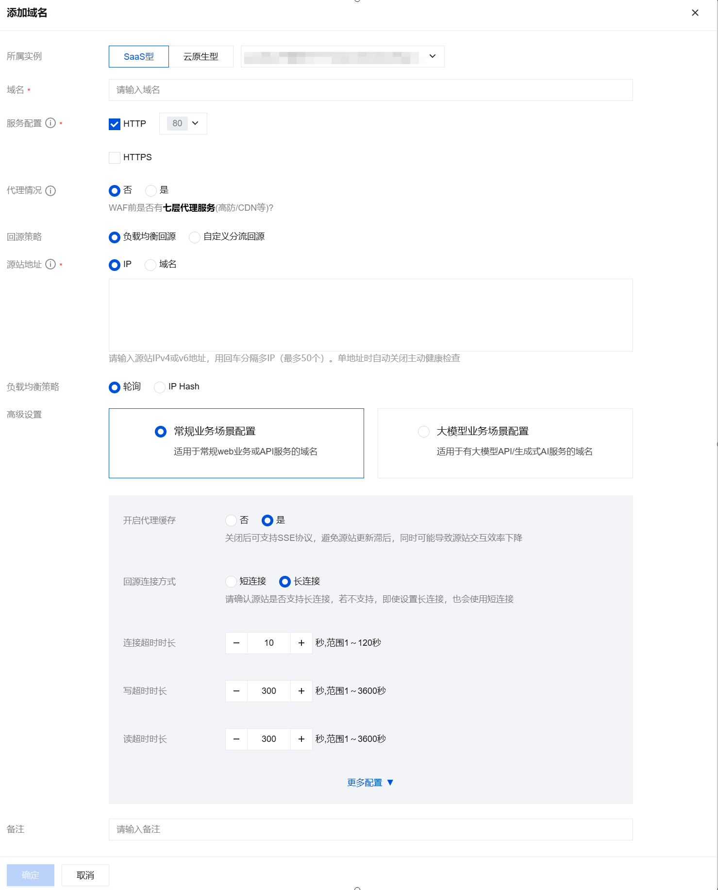 4. 在添加域名页面,根据页面提示配置相关信息,单击确定,即可完成添加域名。