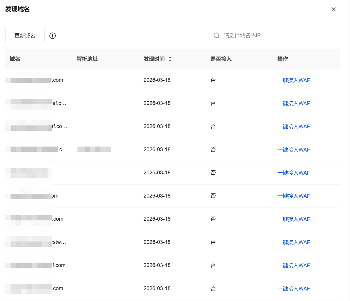5. 在域名接入页面,单击发现域名,自动展示腾讯云资产中心识别的域名信息,且支持一键接入 WAF。