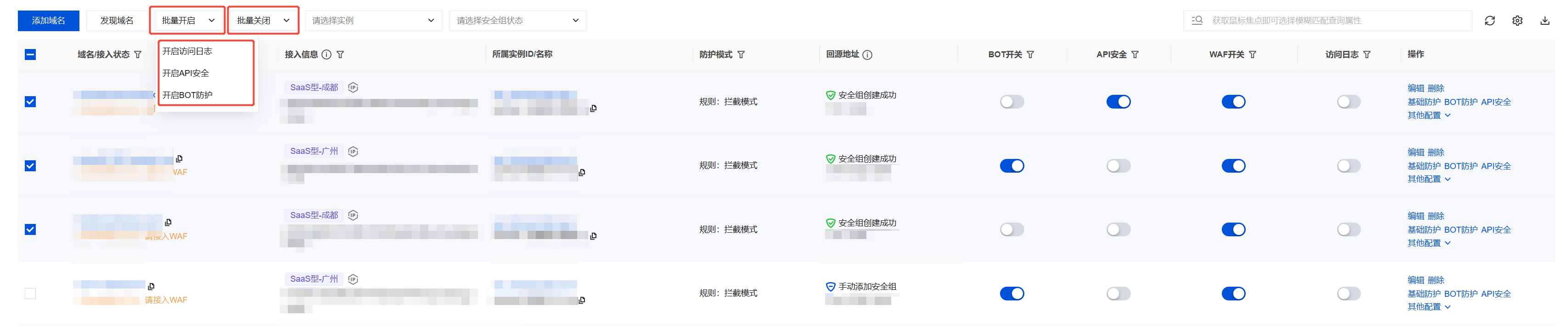 1. 在域名列表页面,勾选多个域名,支持一键批量开启或批量关闭 API 安全、BOT 防护及访问日志开关,弹出确认对话框。