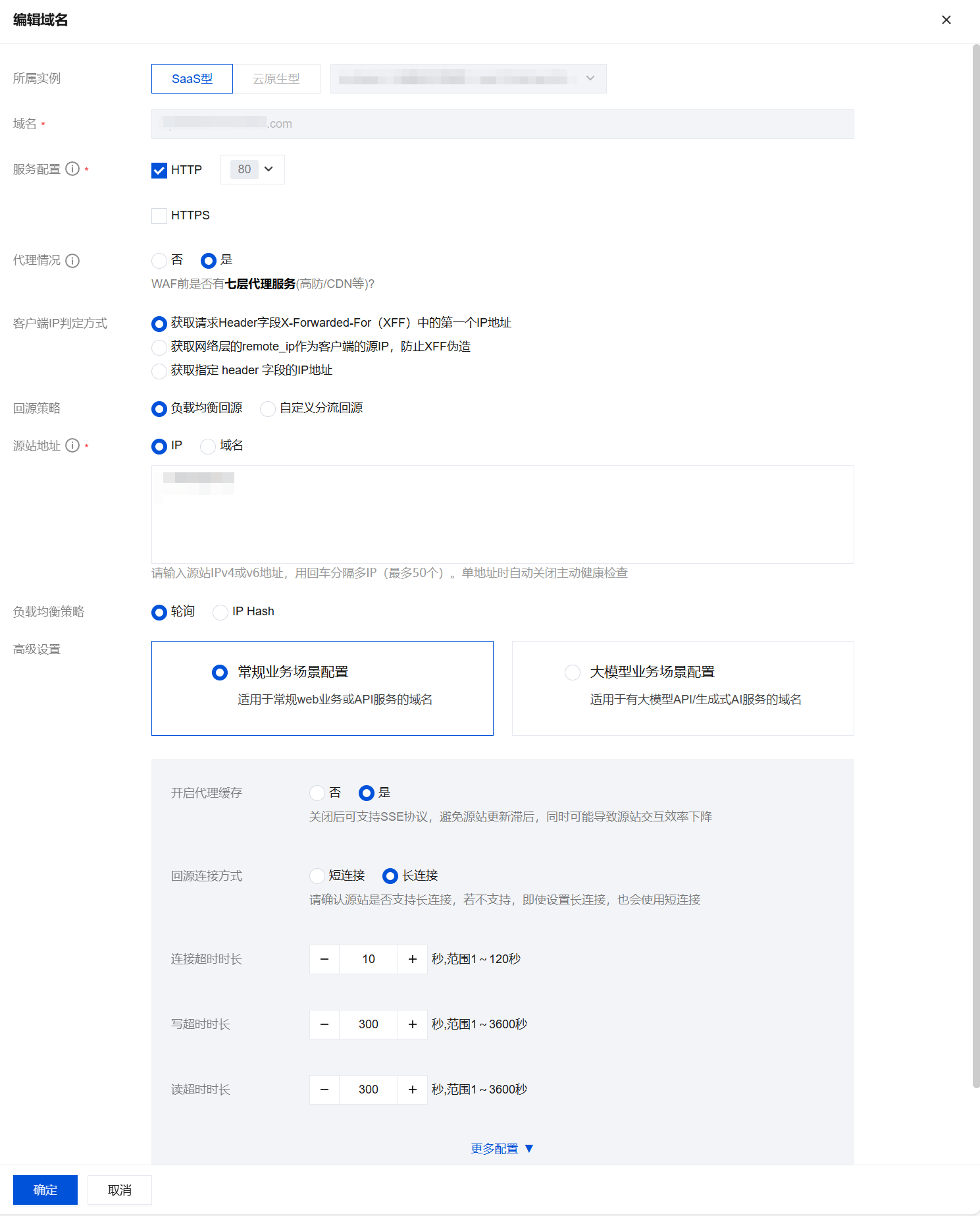 2. 在编辑域名页面,可修改服务配置、代理情况和源站地址等信息,单击确定,即可保存修改。