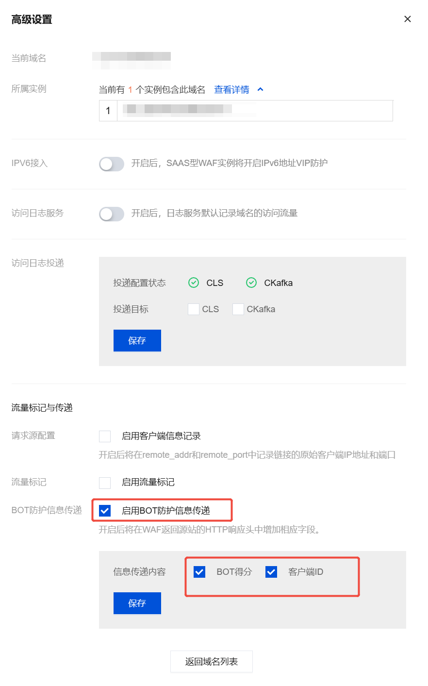 3. 在高级设置弹窗中,勾选启用 BOT 防护信息传递,并选择需要传递的信息内容,单击保存。