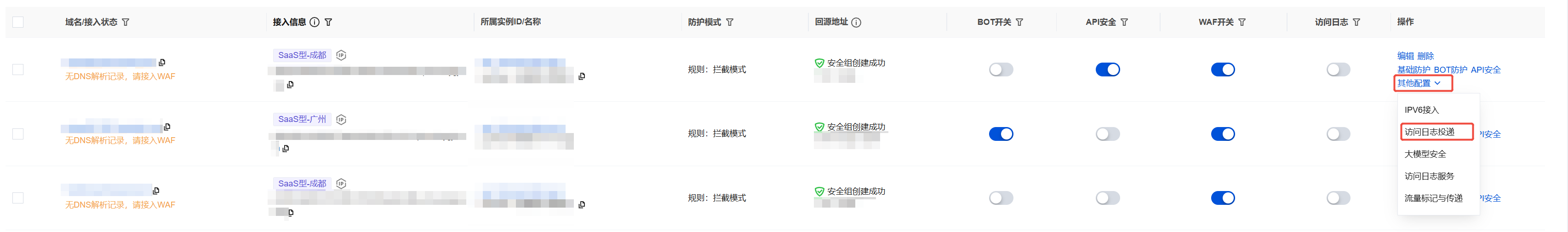 1. 在域名接入页面,选择所需域名,单击操作列的其他配置 > 访问日志投递。