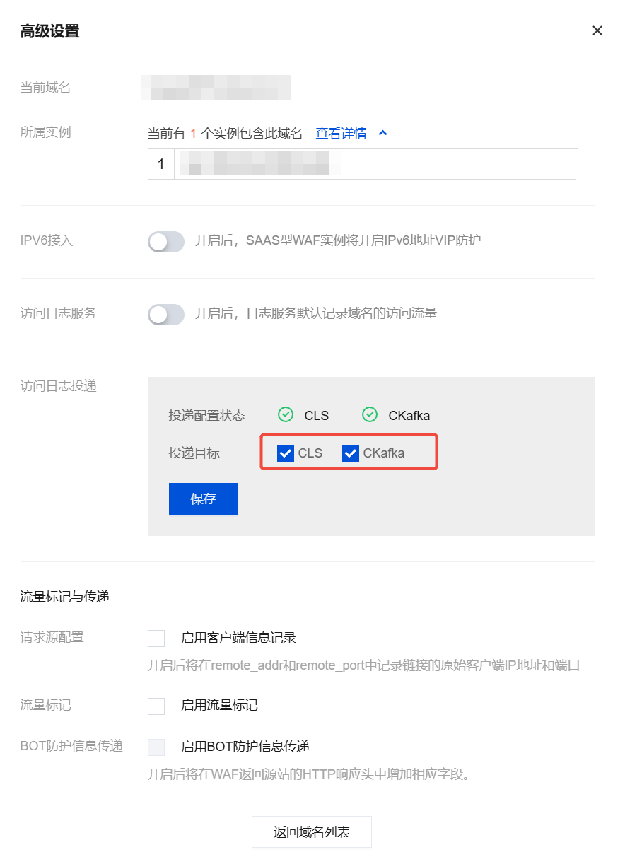 3. 在高级设置弹窗中,勾选投递目标后,单击保存,即可开启访问日志投递功能。