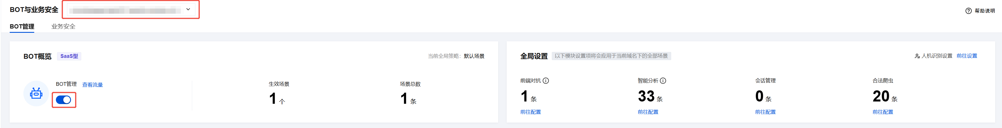 2. 在 BOT 与业务安全页面,左上角选择需要防护的域名,开启 BOT 管理。