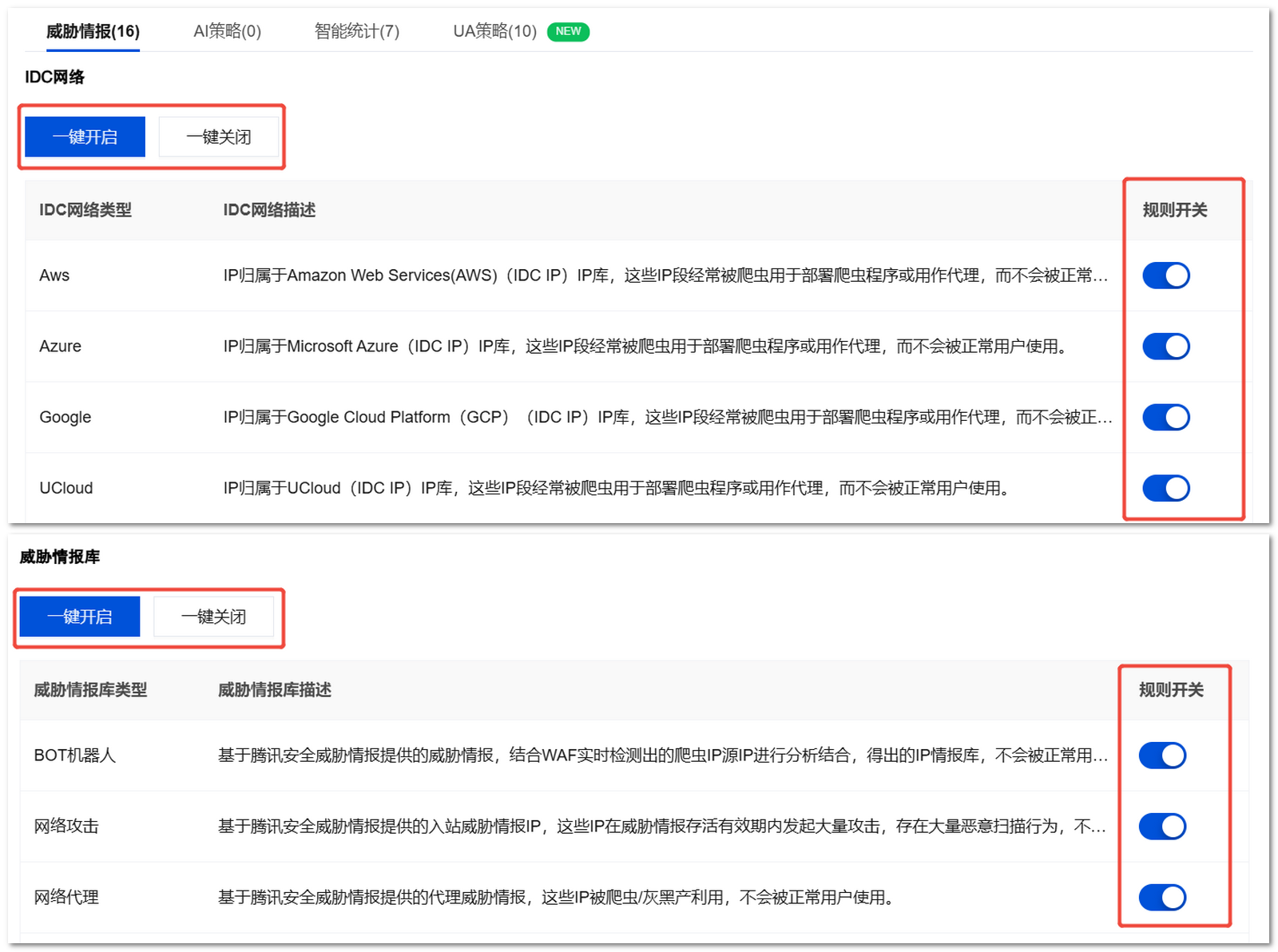 4. 单击威胁情报。在威胁情报配置页面,可以配置识别项开关,也可以一键开启/关闭识别项的开关。
