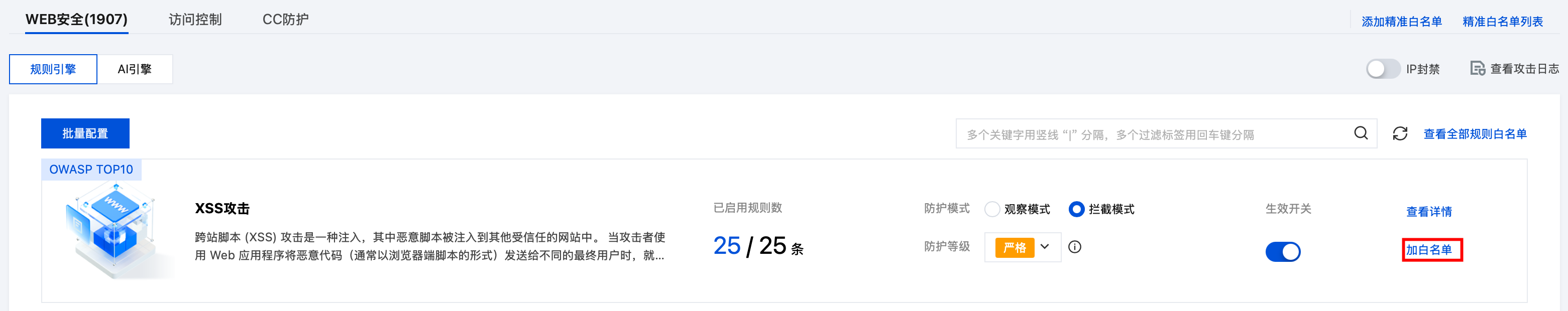 4. 在规则引擎页面,单击攻击类型规则集右侧的加白名单。