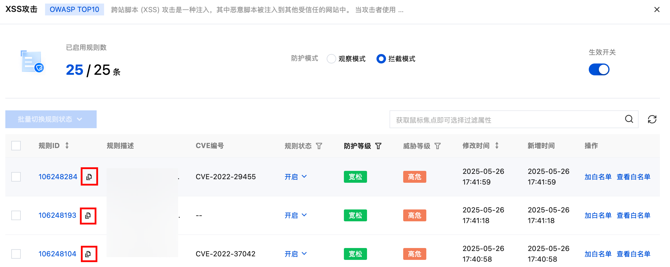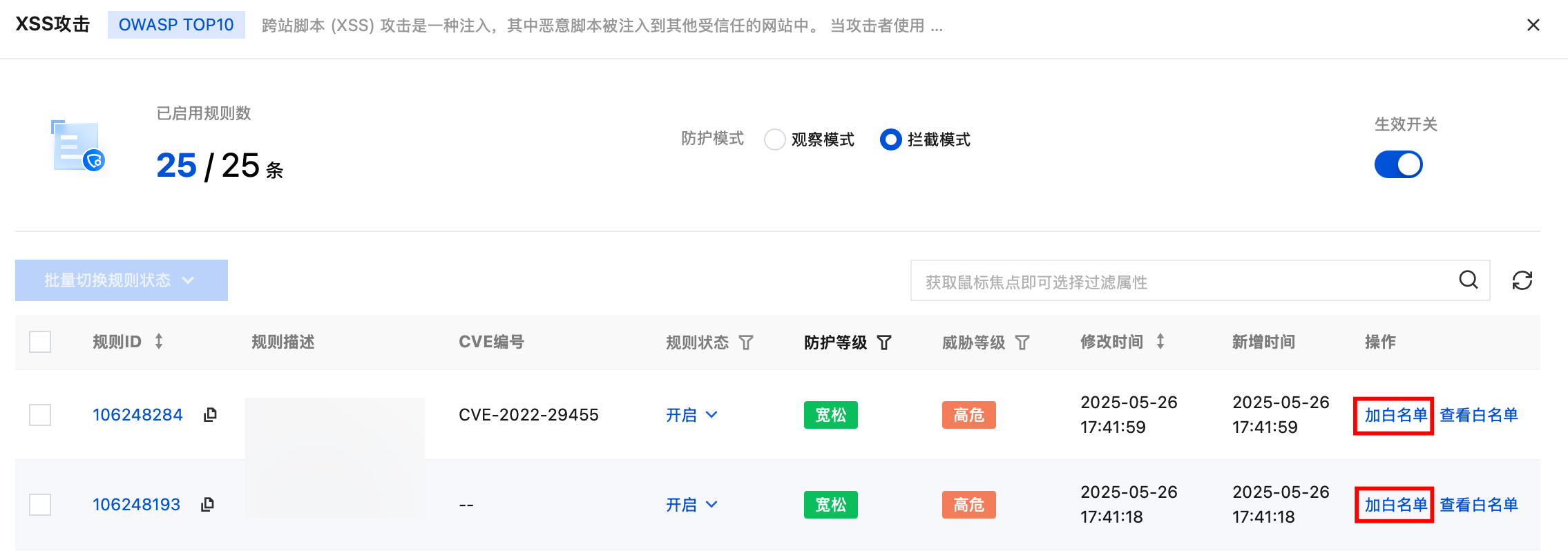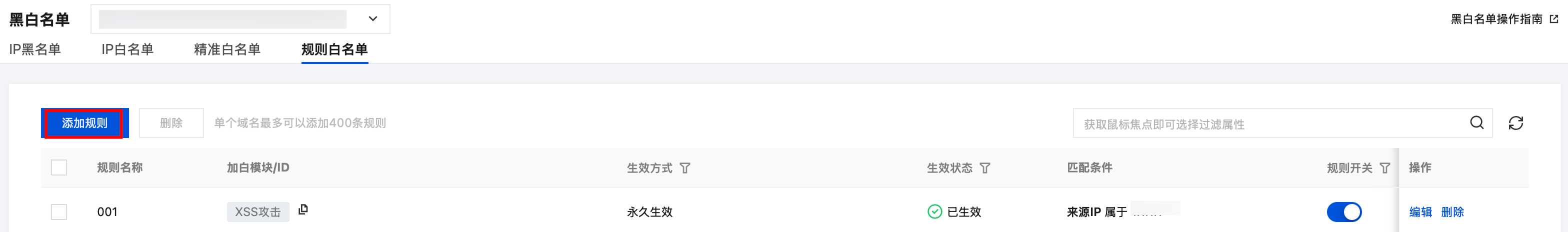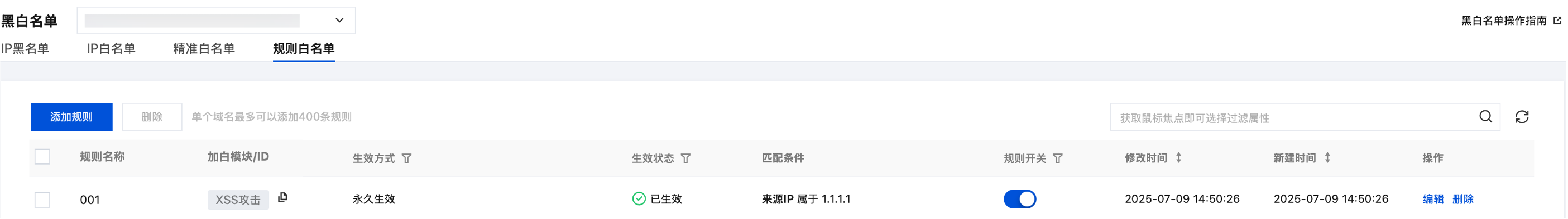 6. 白名单添加完成后,即可在规则白名单页面查看白名单规则,并进行相关操作。支持在规则开关列启用或停用白名单规则,可在操作列编辑或删除白名单规则,并支持批量删除规则。