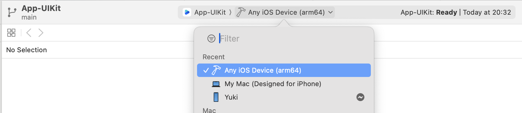 3. 选择设备:在 Xcode 如下图所示处选择您要将 Demo 运行到的设备: