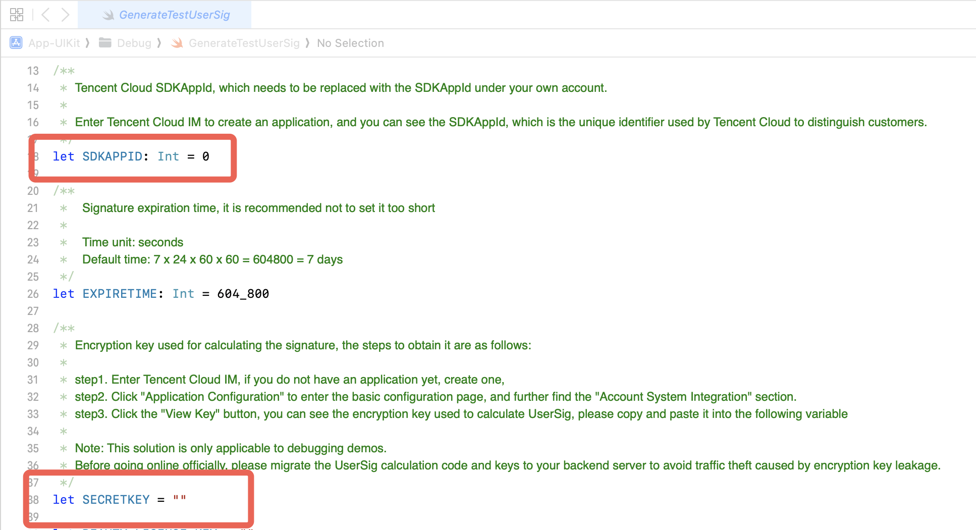 /application/Debug/GenerateTestUserSig.swift文件,将 开通服务 时获取到的对应的 SDKAppID 和 SDKSecretKey 填入其中: