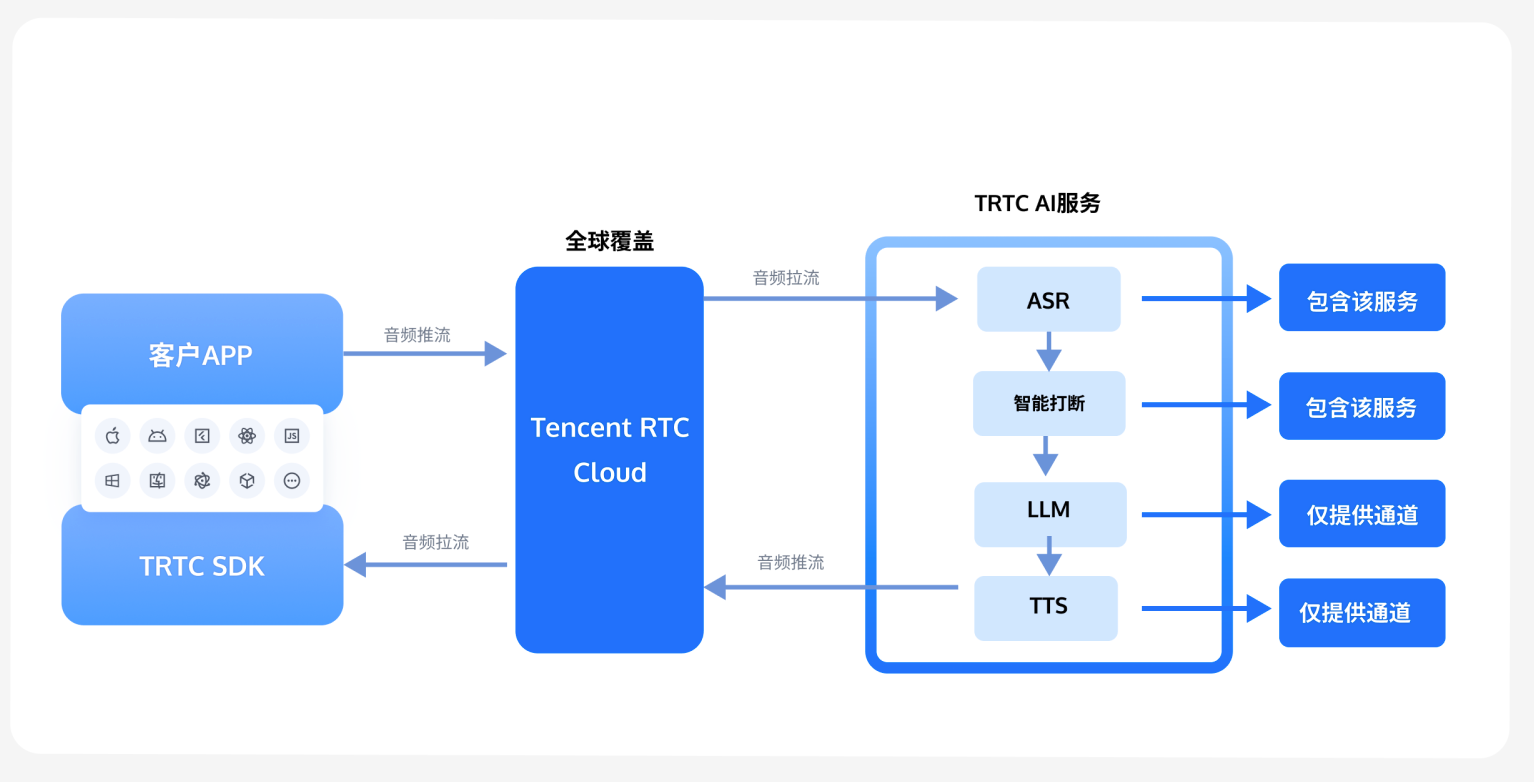 实时音视频 AI 对话解决方案包括内置的语音转文本(Speech-To-Text,STT)和智能打断,同时提供通道服务,支持客户灵活接入指定的 AI 模型(Large Language Model,LLM)和文本转语音(Text To Speech,TTS)模型服务,以创建自然流畅的 AI 对话效果。