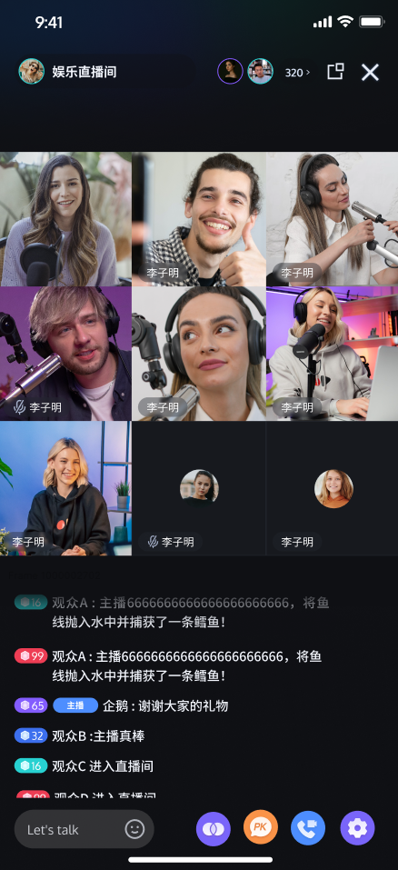 连麦互动:支持直播过程中与观众 或 与其它直播间主播实时互动;