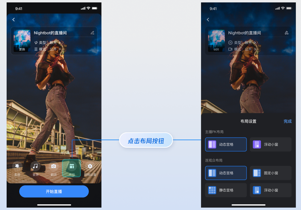 TUILiveKit 提供 4 种直播布局模板,您可在主播开播页的 UI 交互「布局」入口 选择合适样式: