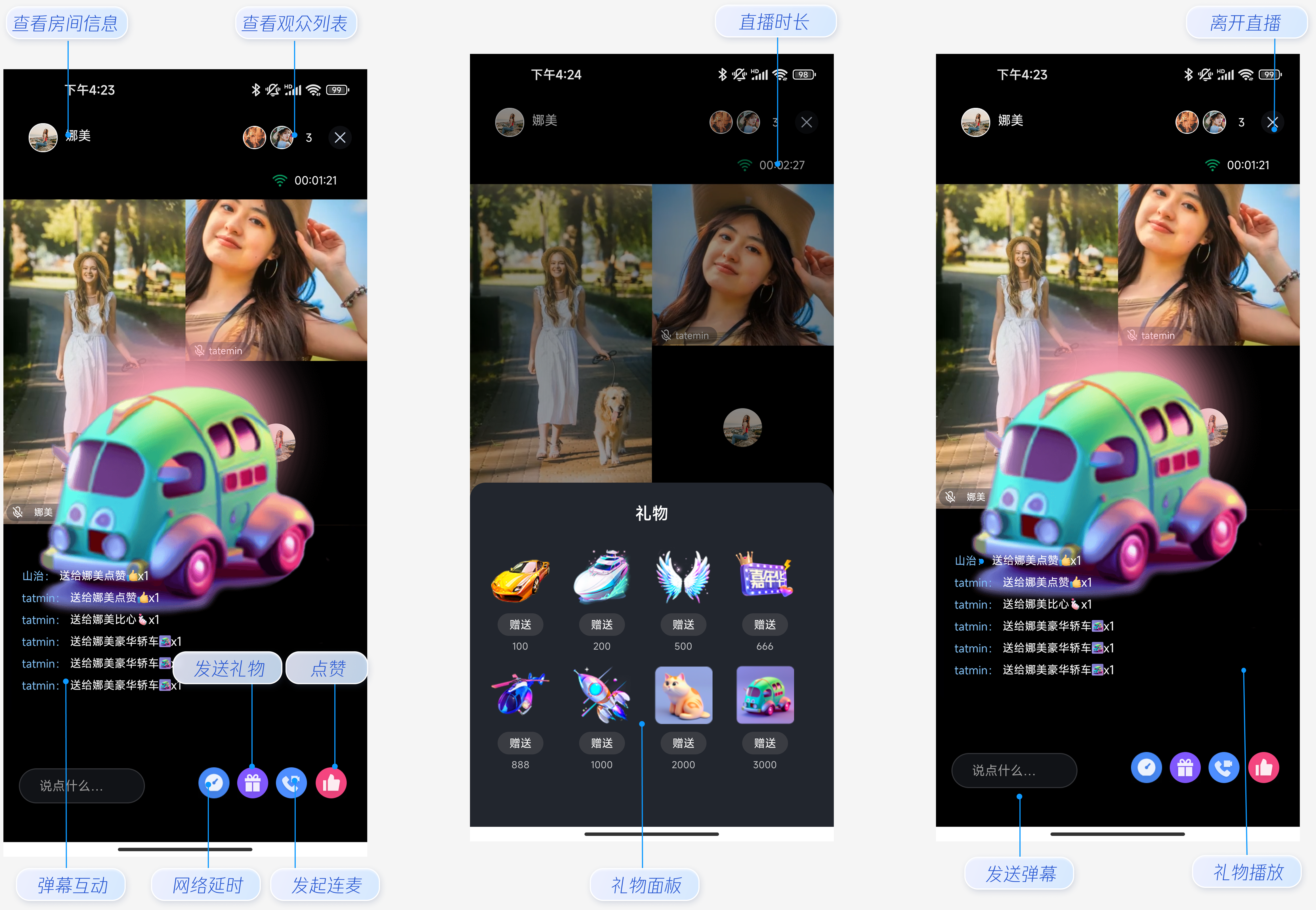 观众观看页提供默认的行为和样式,但如果默认行为和样式不能完全满足您的需求,您也可以对 UI 进行自定义。下图介绍了观众观看页的主要功能,其中包含直播信息展示、发起连麦、查看观众列表、发送礼物、直播时长、弹幕互动、礼物播放、点赞等。