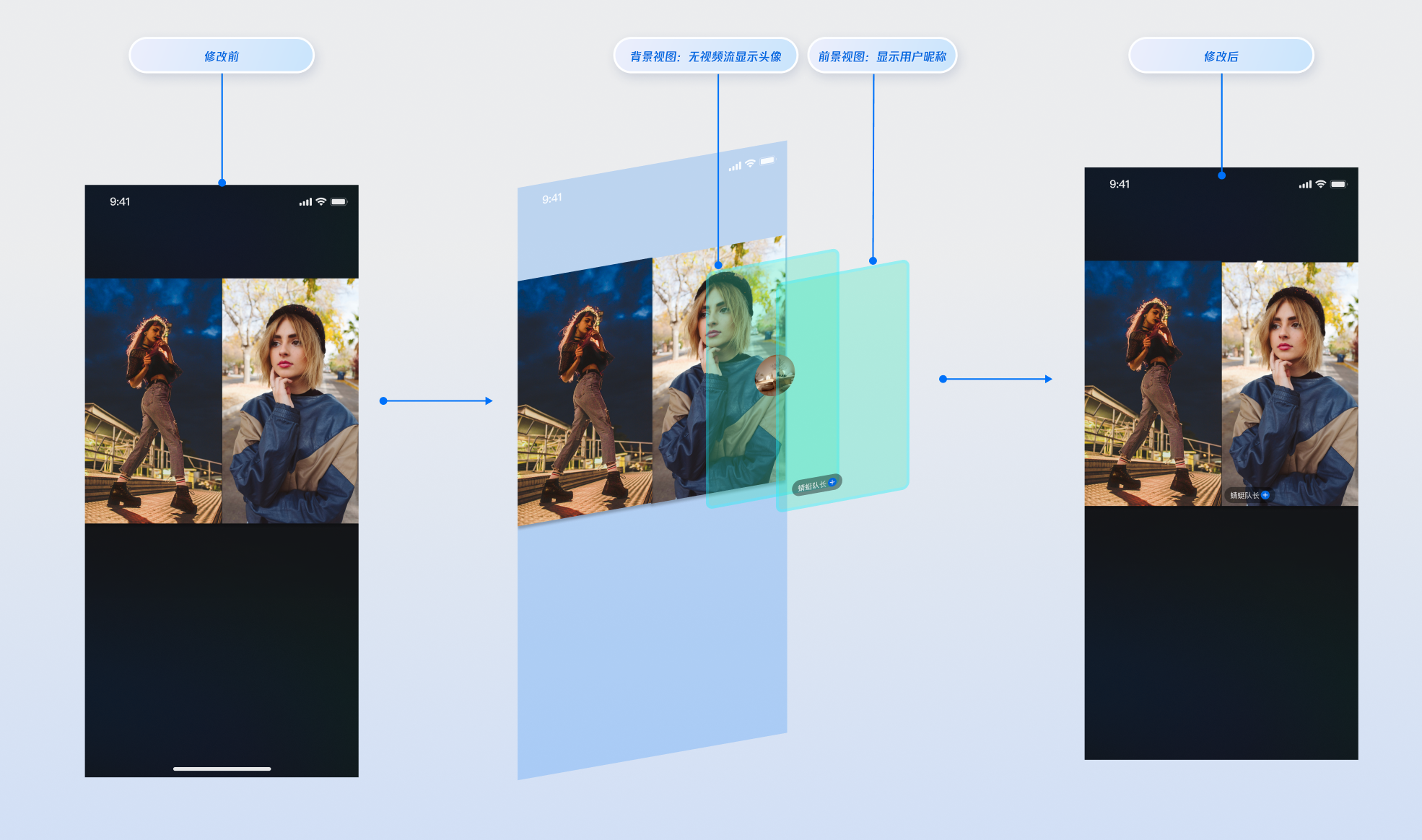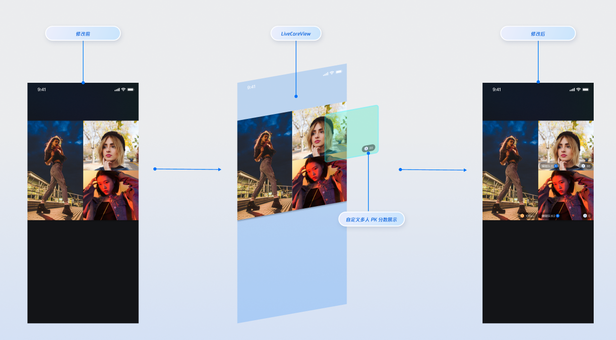 LiveCoreView.VideoViewDelegate 协议提供的“插槽”能力,在视频流画面上添加自定义视图,用于显示昵称、头像、PK 进度条等信息,或在他们关闭摄像头时提供占位图,以优化视觉体验。实现视频流画面的昵称显示