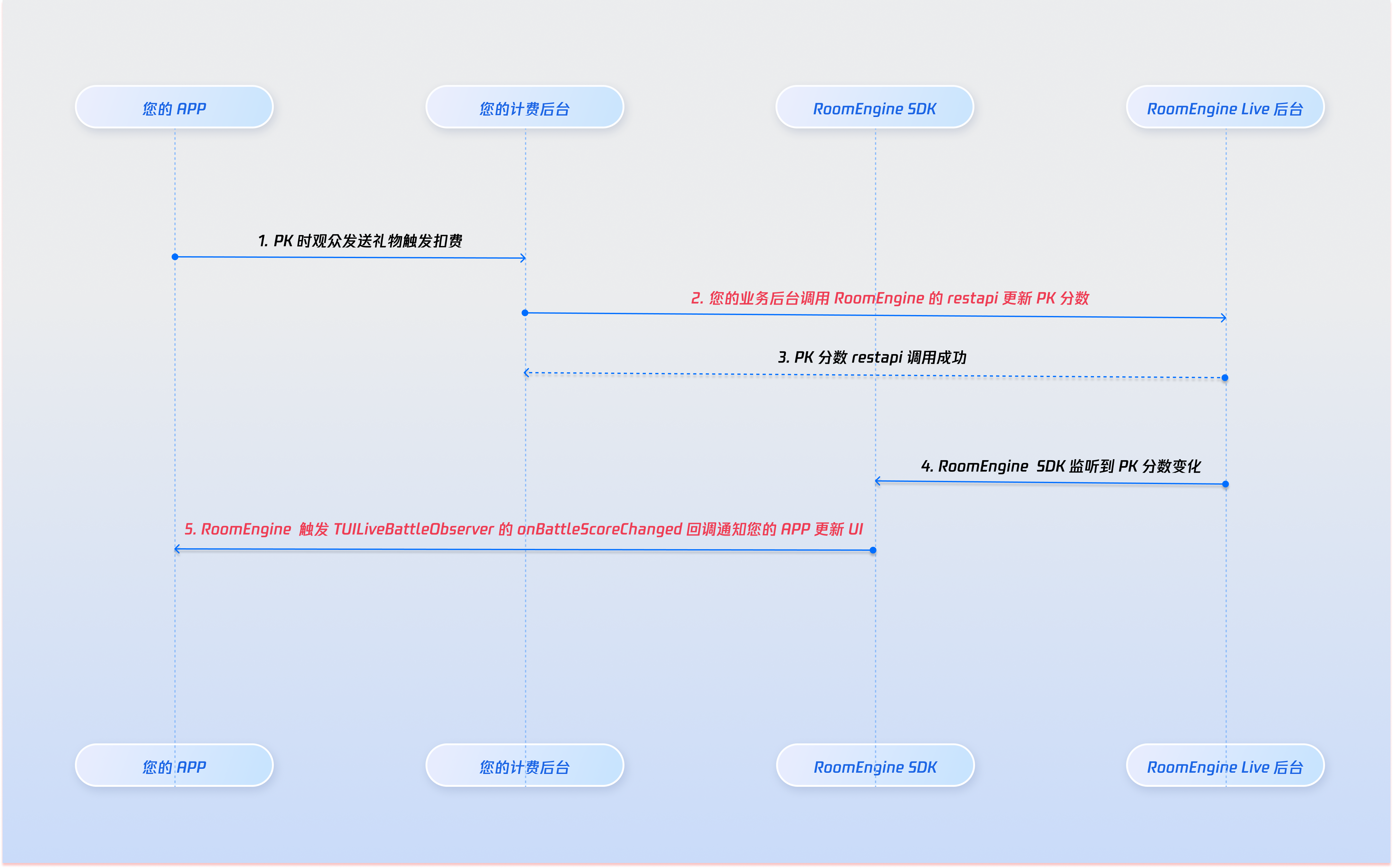 如上图所示,当您的计费系统检测到有观众送礼并且计费成功后,您可以调用 修改 PK 分数的 REST API 更新当前主播的 PK 分值。当主播的 PK 分值发生变化后,参与 PK 的直播间中的所有用户(包含主播和观众)的