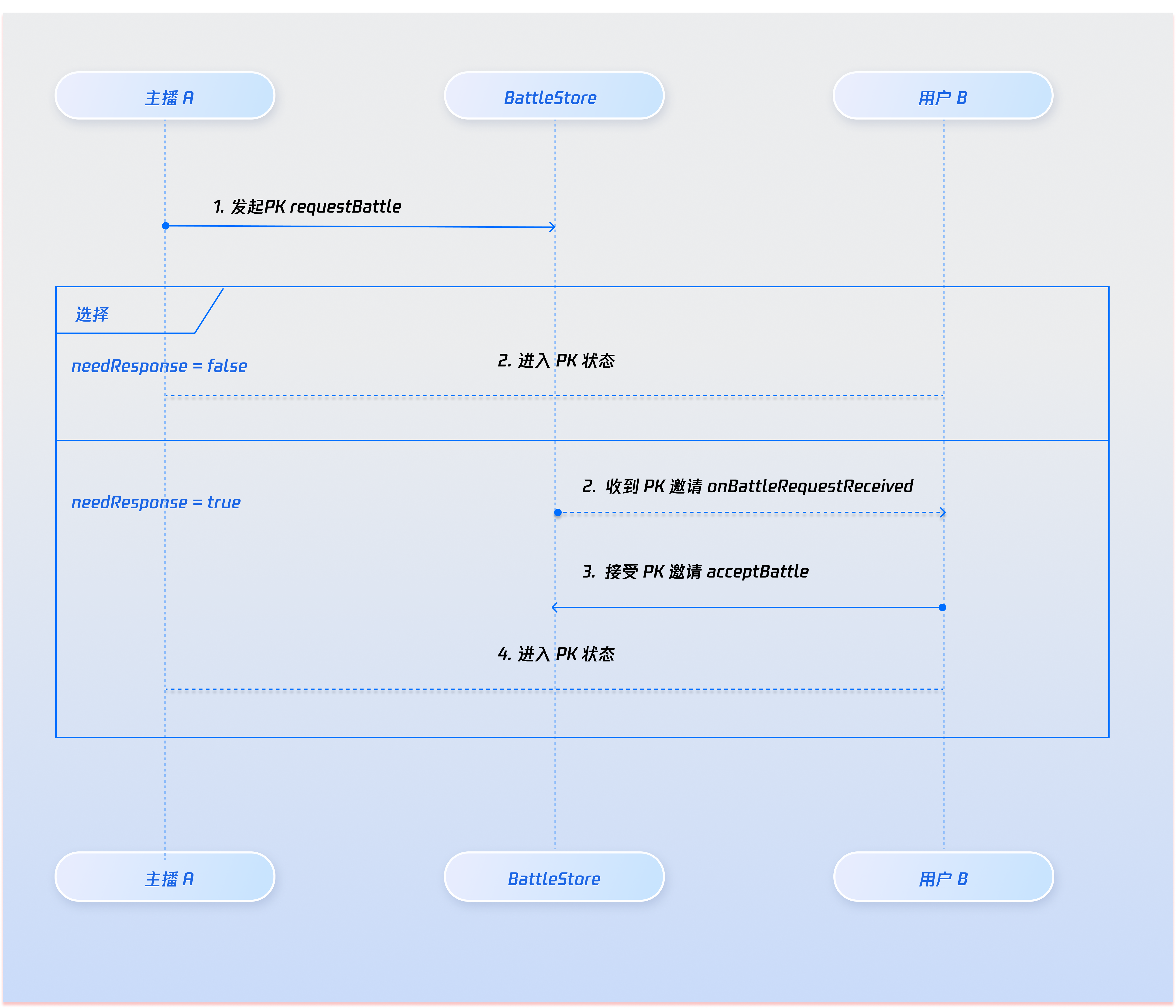 needResponse 设置为 true,则当被邀请的所有对端主播都调用 BattleStore 的 acceptBattle 接口同意后进入 PK 状态。当