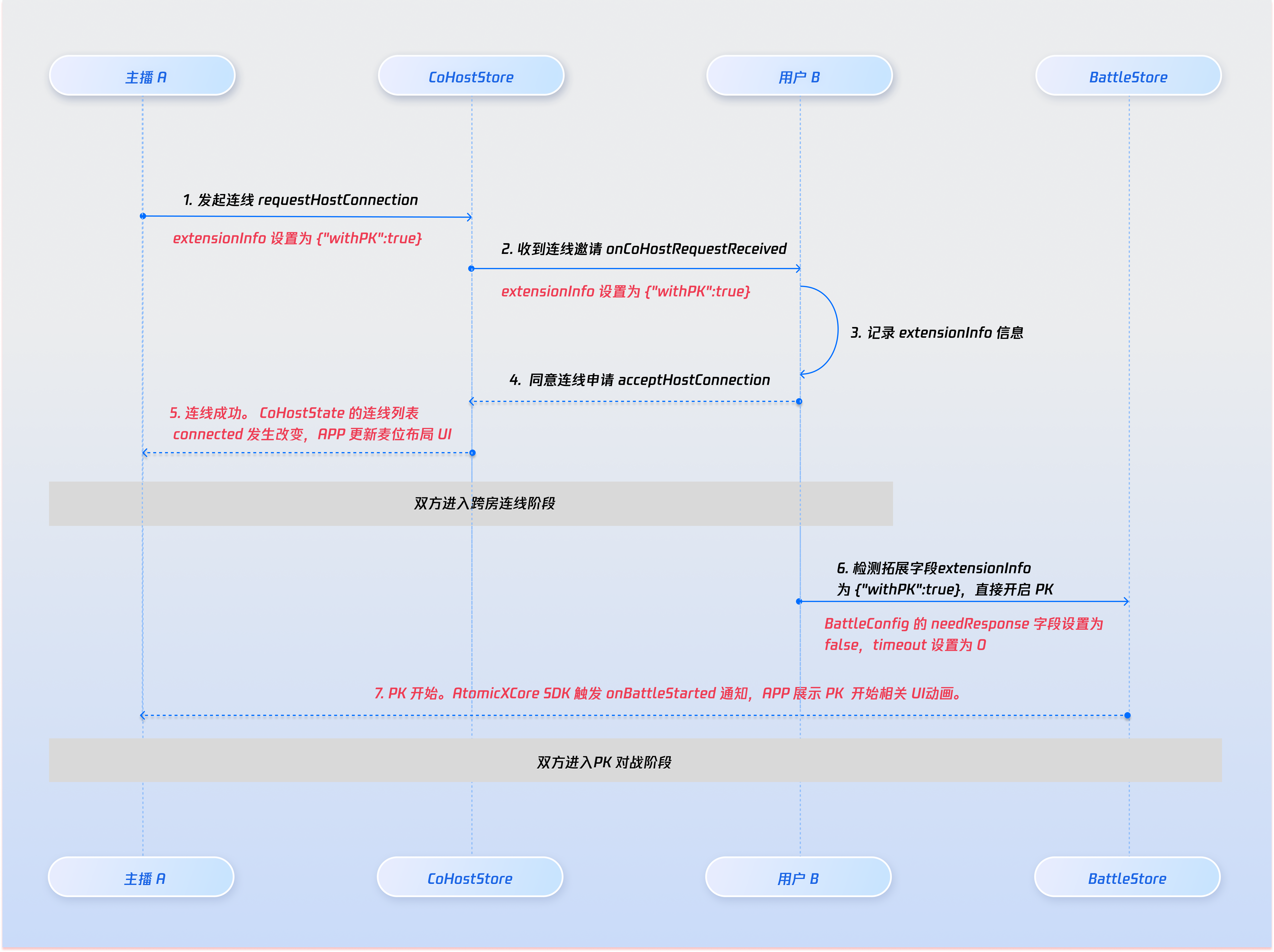 AtomicXCore 支持您设置 PK 的时长、是否需要对端主播同意才开始 PK 以及发起 PK 时携带扩展信息。您可以调用 BattleStore 的 requestBattle 接口发起 PK 邀请。说明: