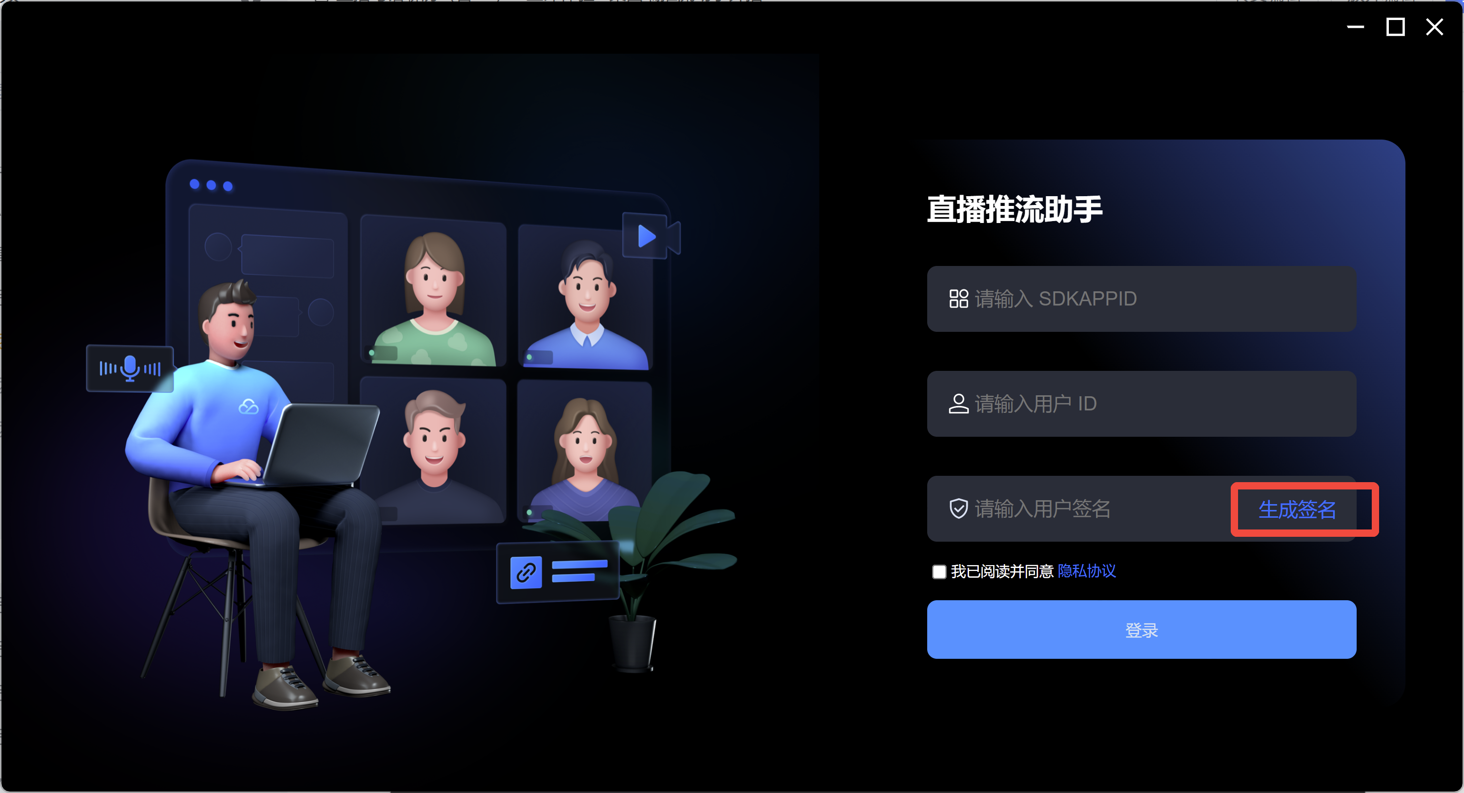 打开已安装的 PC 推流助手,您将看到登录界面。在登录页面,请准确填入您准备好的应用 ID(SDKAppID)、用户 ID 和 用户签名(UserSig)。