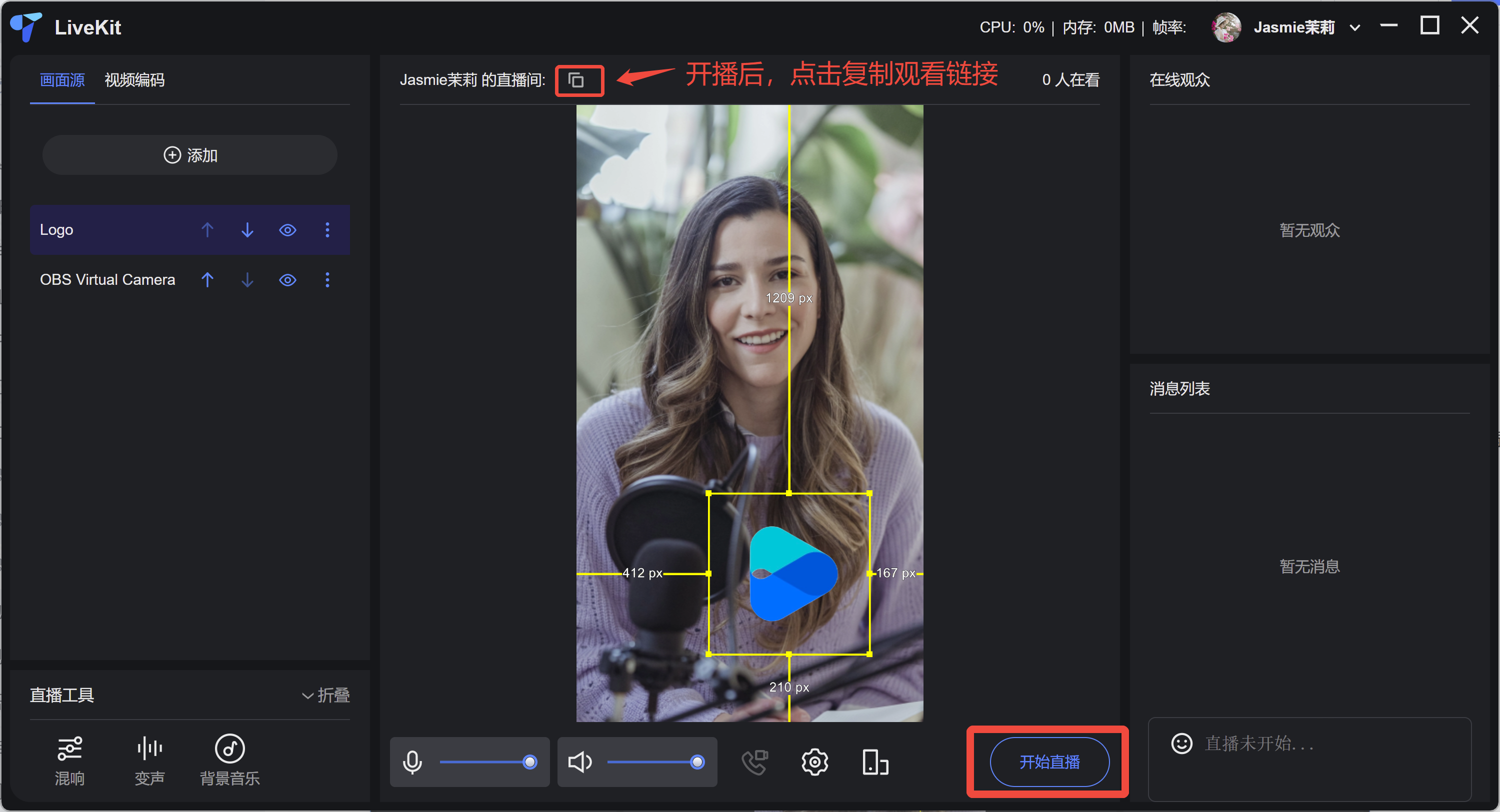 在中间的画布区域,您可以通过拖拽、缩放来自由排版您的直播画面。