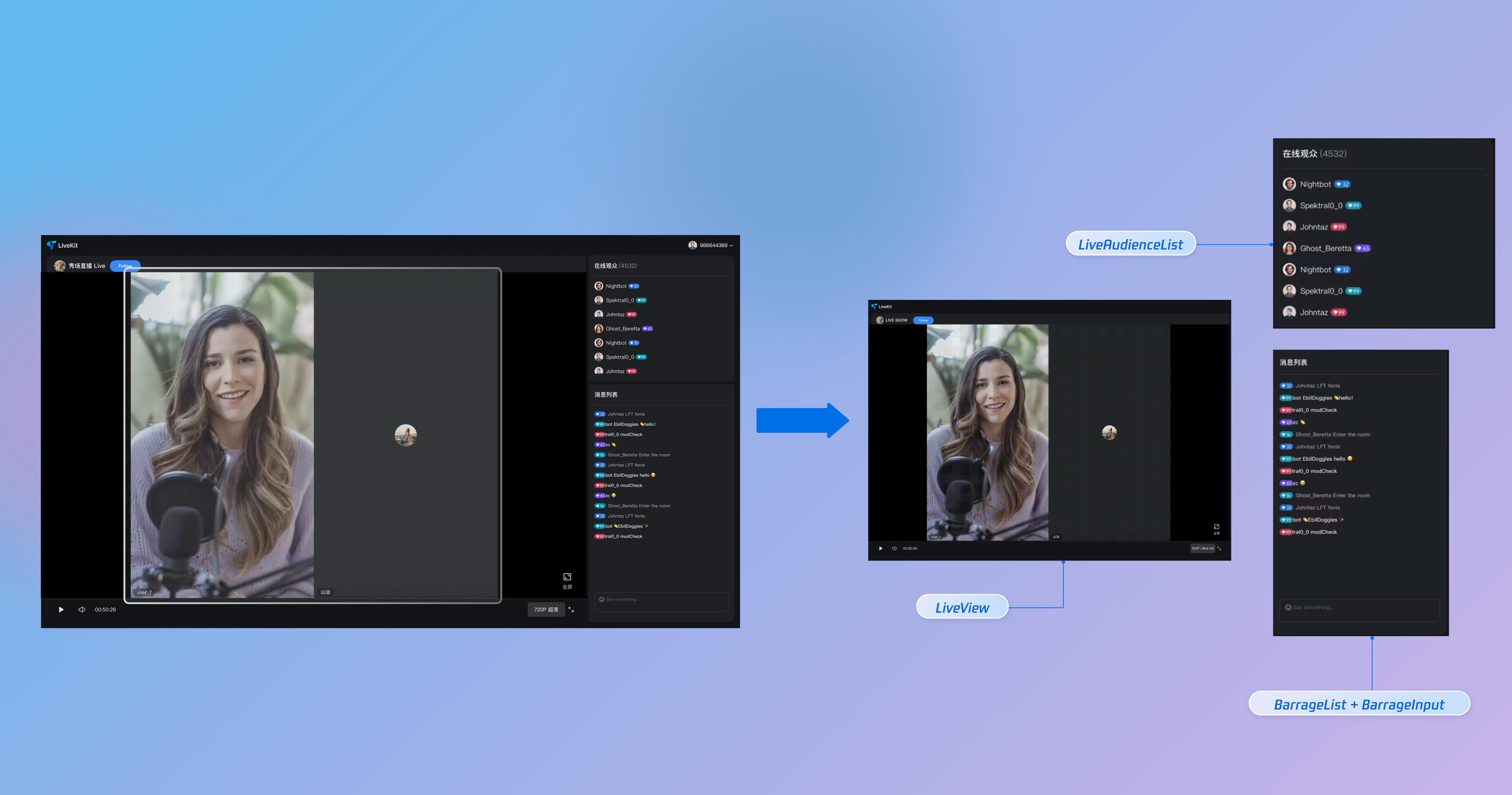 LiveAudienceState | 观众管理:获取实时观众列表(ID / 名称 / 头像),统计观众数量,监听观众进出事件。 |