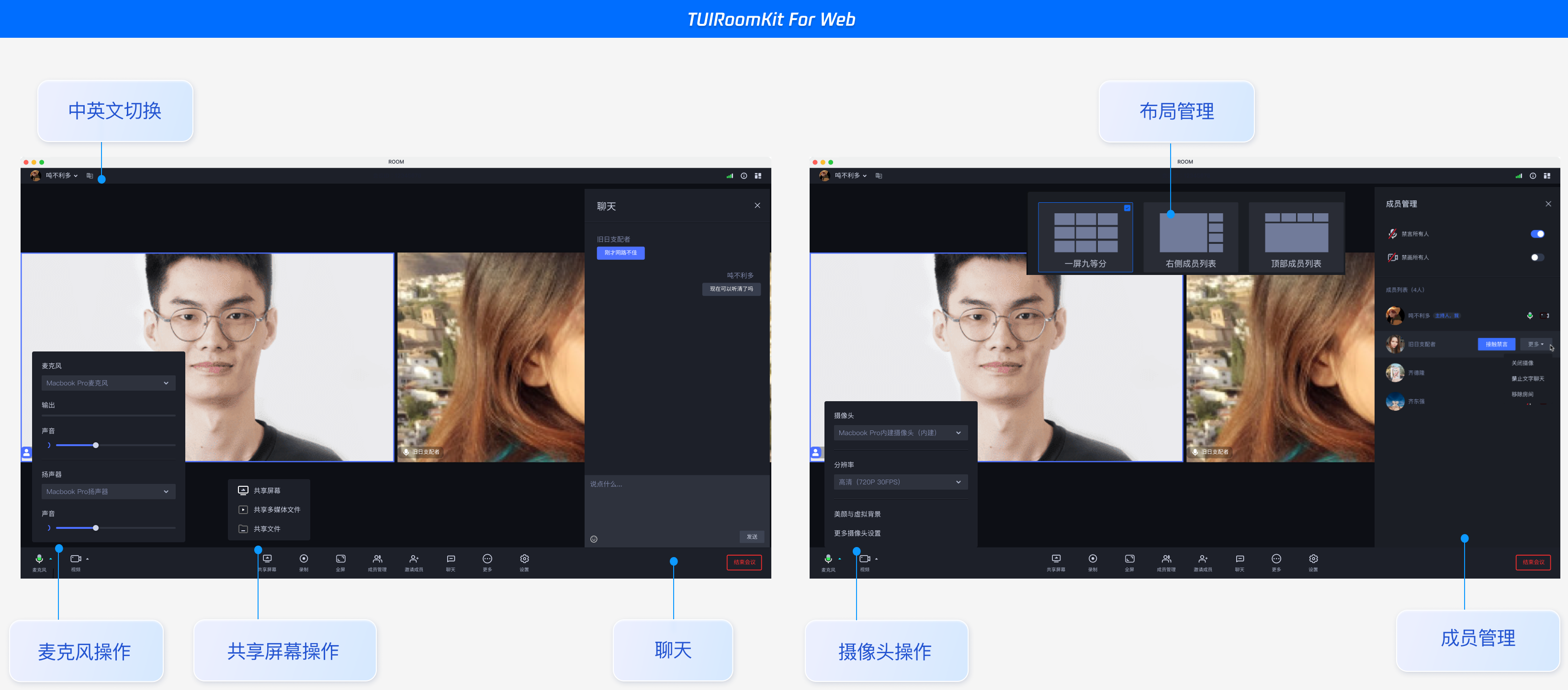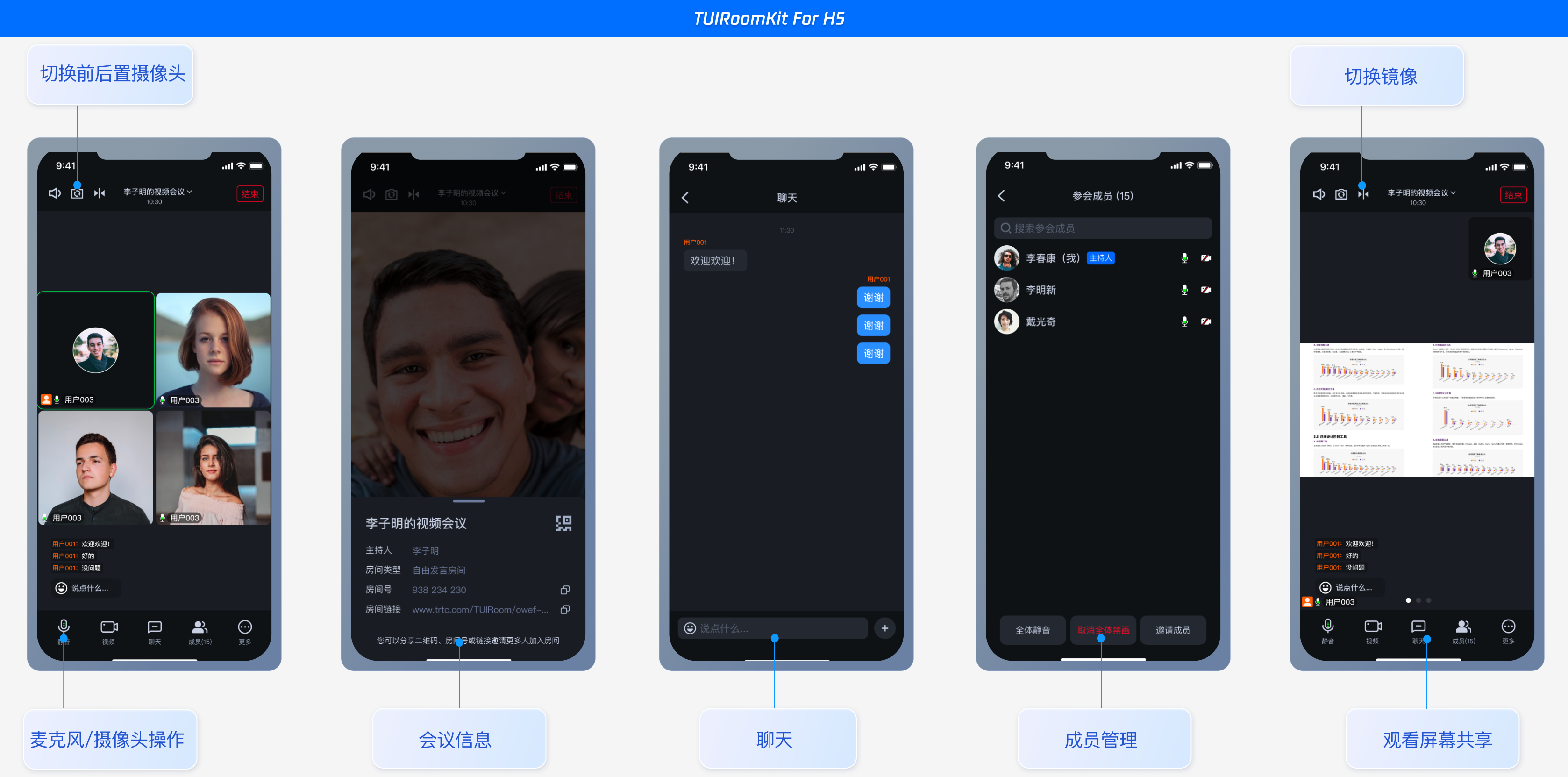 TUIRoomKit 是腾讯云推出的多人音视频 UI 组件。组件提供房间管理,音视频控制,屏幕共享,成员管理,麦位管理,即时聊天,自定义布局切换等丰富的功能交互,同时支持中英文切换,一键换肤等能力。