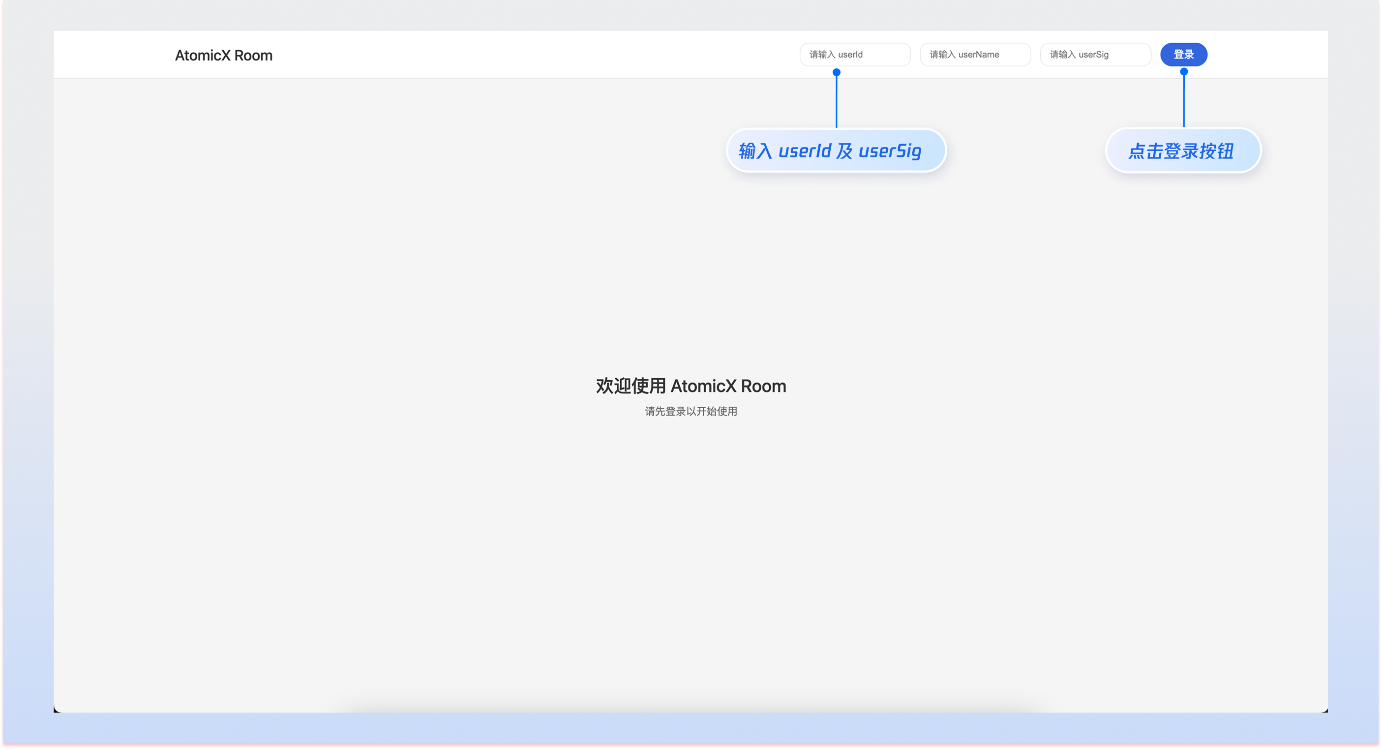 启动成功后,请在浏览器中打开调试地址(通常为 http://localhost:5173)访问应用。您将看到 Atomicx Room 的示例 Demo。