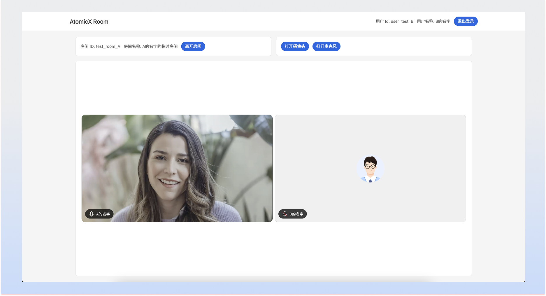 在窗口 B 中:输入相同的房间 ID("test_room_A"),点击加入房间。