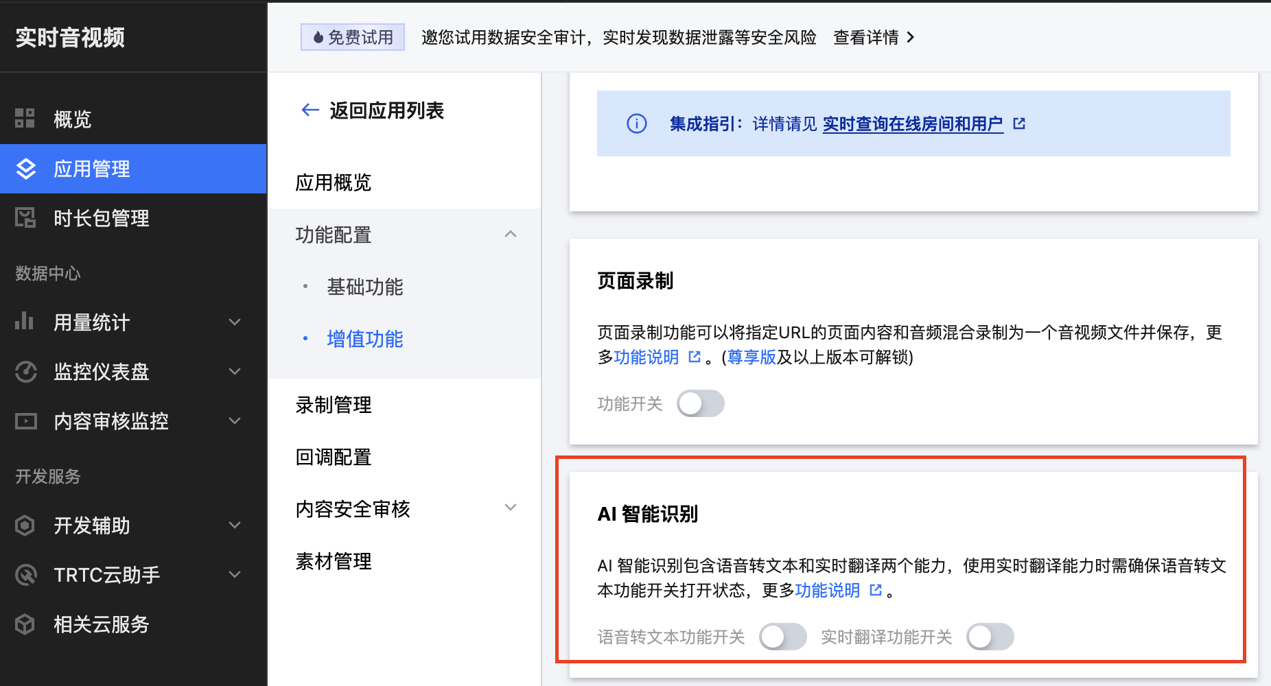 前往 控制台 > 功能配置 > 增值功能 开启 AI 智能识别的语音转文字、实时翻译功能。