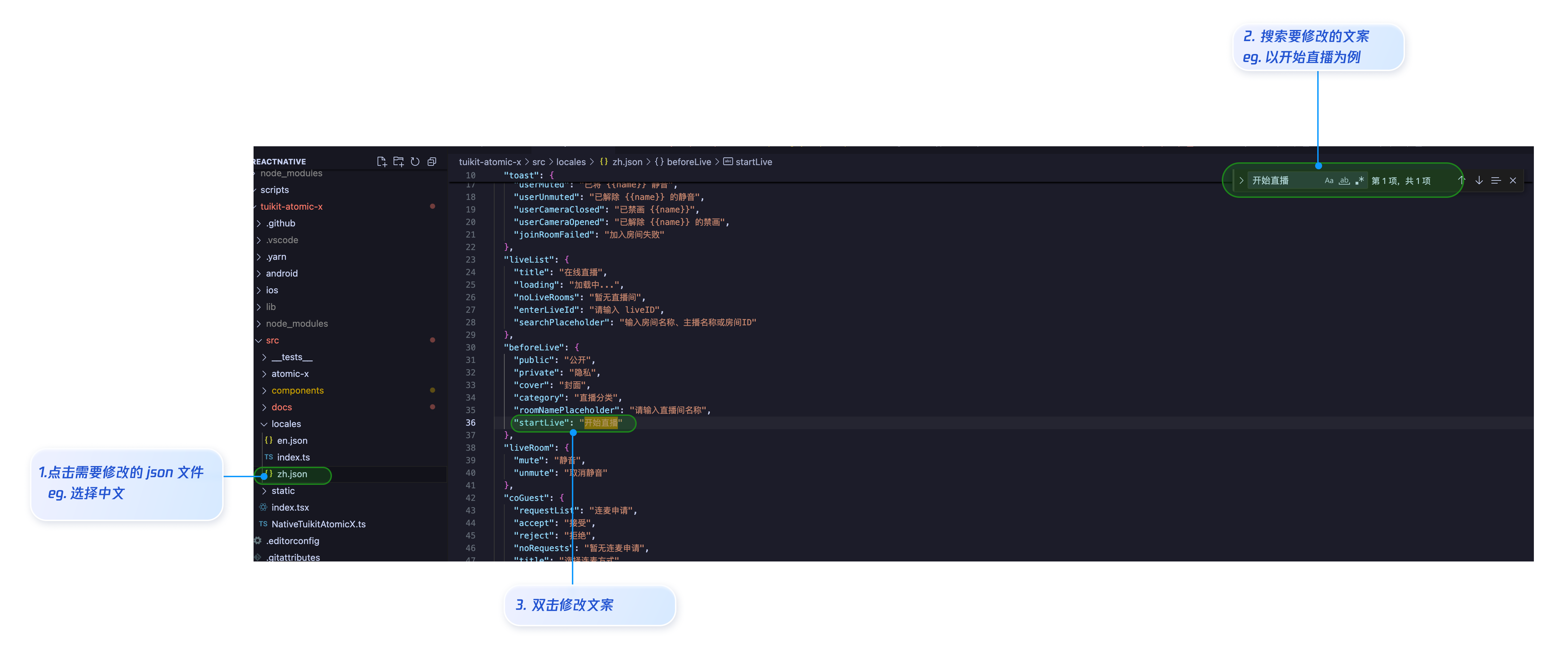 TUILiveKit 的 UI 文案显示有统一文件管理。您可以直接编辑 tuikit-atomic-x/src/locales/ 目录下的 json文件来修改需要调整的文案。