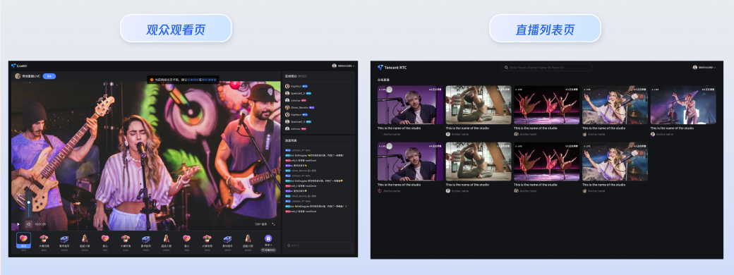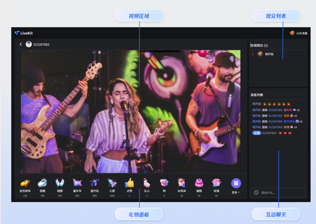 观众端: 支持观看高清直播、弹幕互动聊天、礼物打赏。