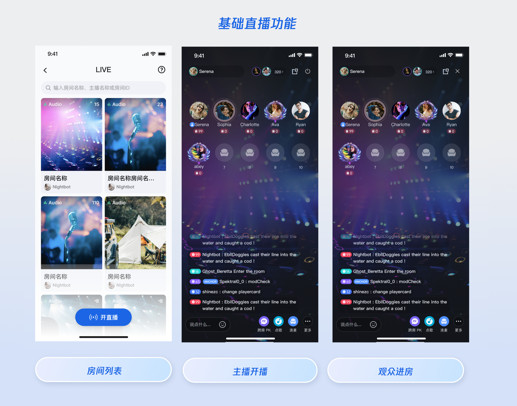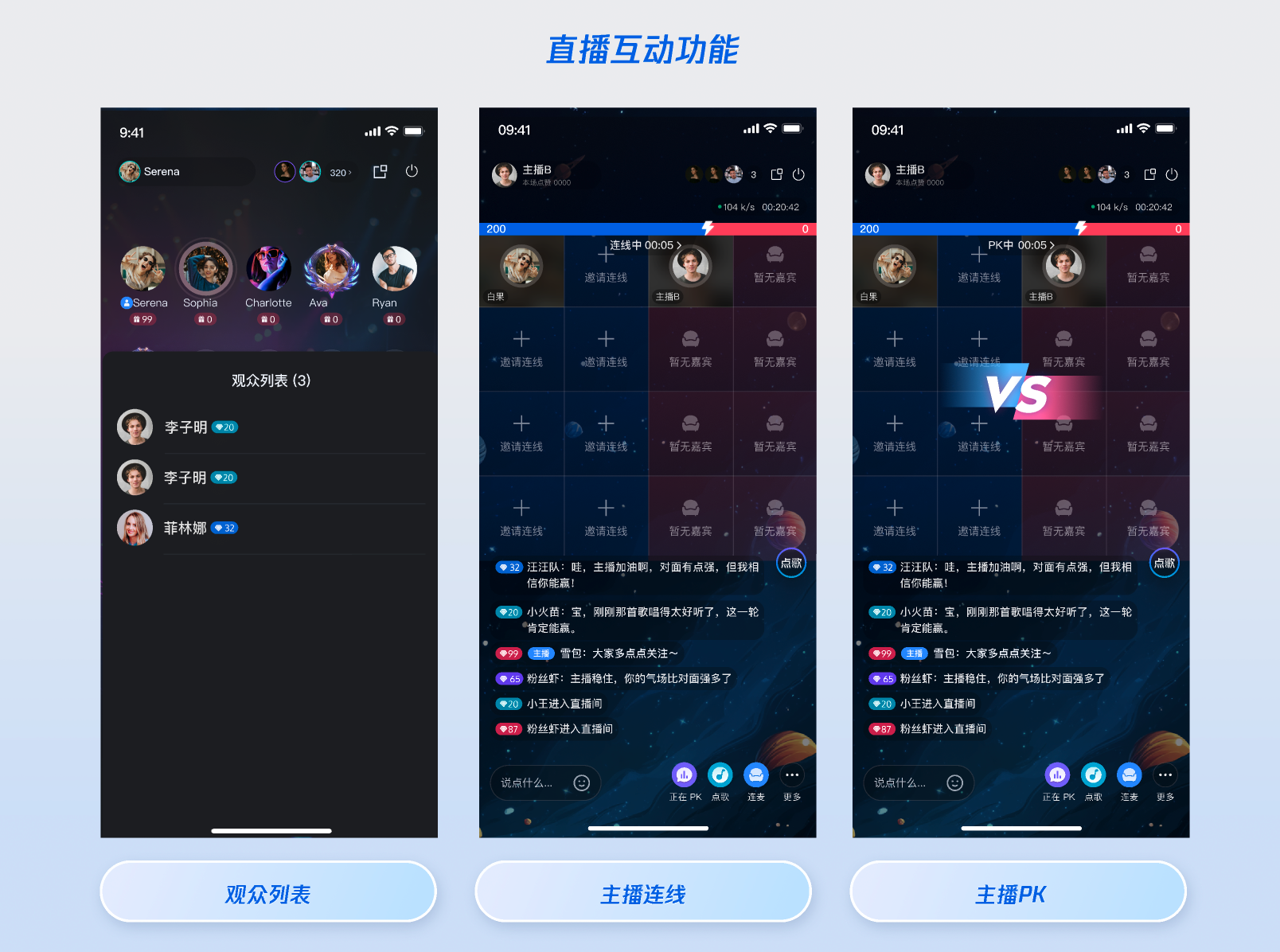 实时互动:多人连麦、观众列表、主播连线、跨房 PK。