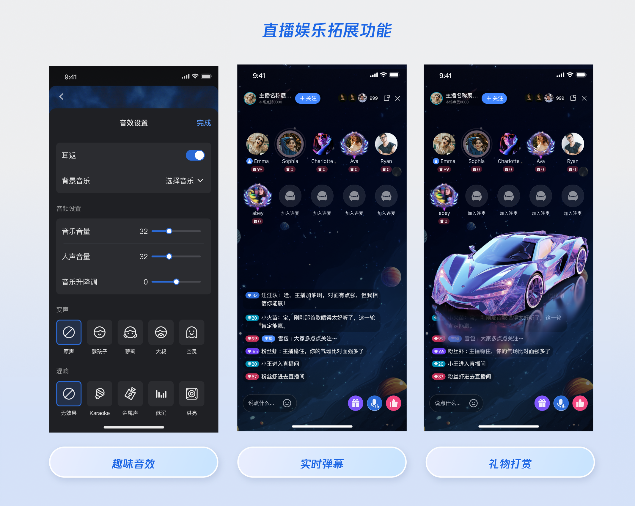 娱乐特效:美颜滤镜、礼物打赏、实时弹幕、趣味音效。