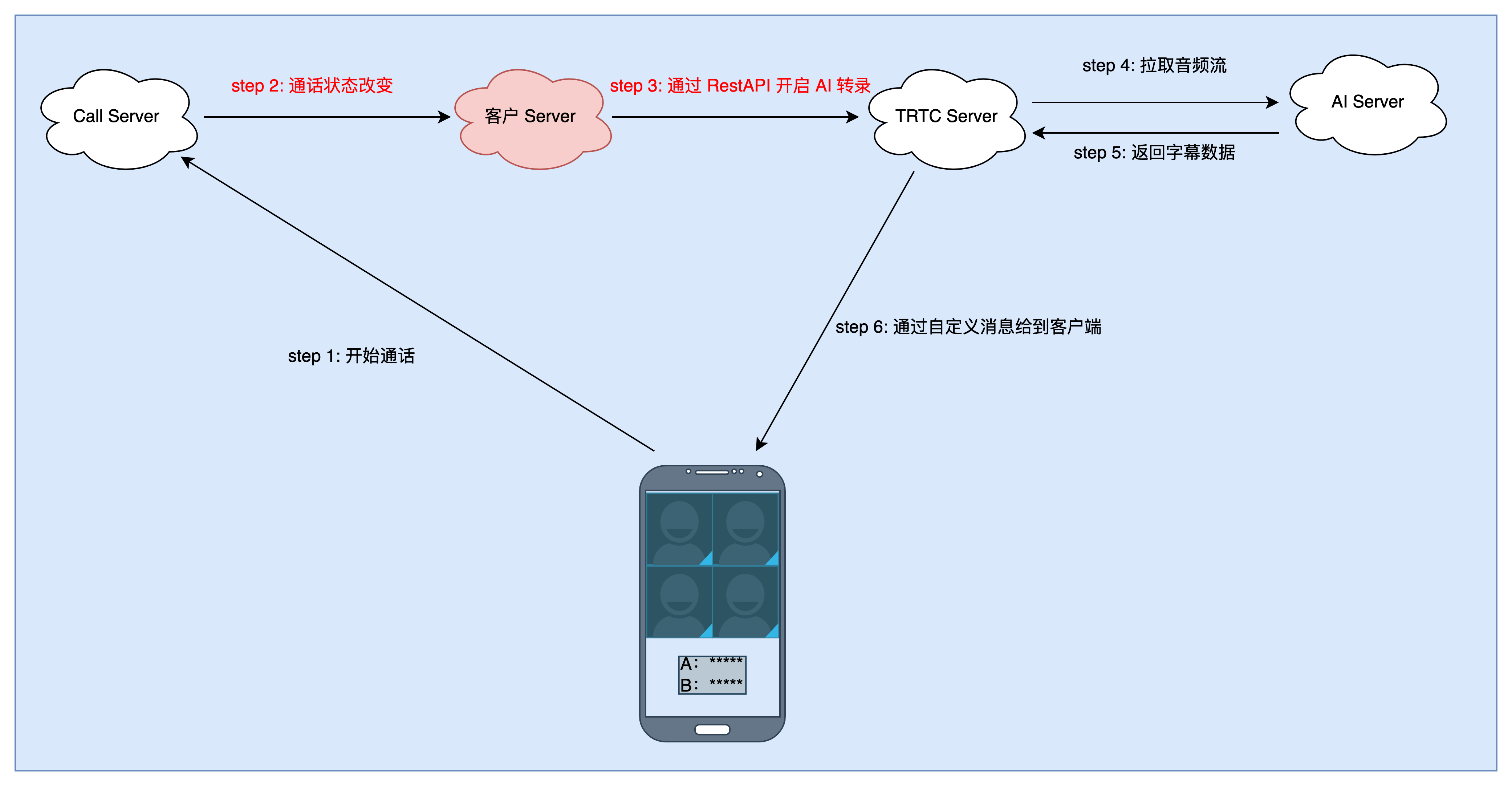 2. 当开始通话后,客户在服务端通过 RestAPI 开启 AI 转录功能。