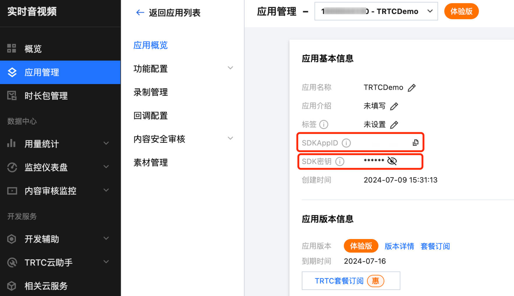 2. 在创建应用成功后,您可以在应用管理中获取到您的 SDKAppID 和 SDK 密钥。