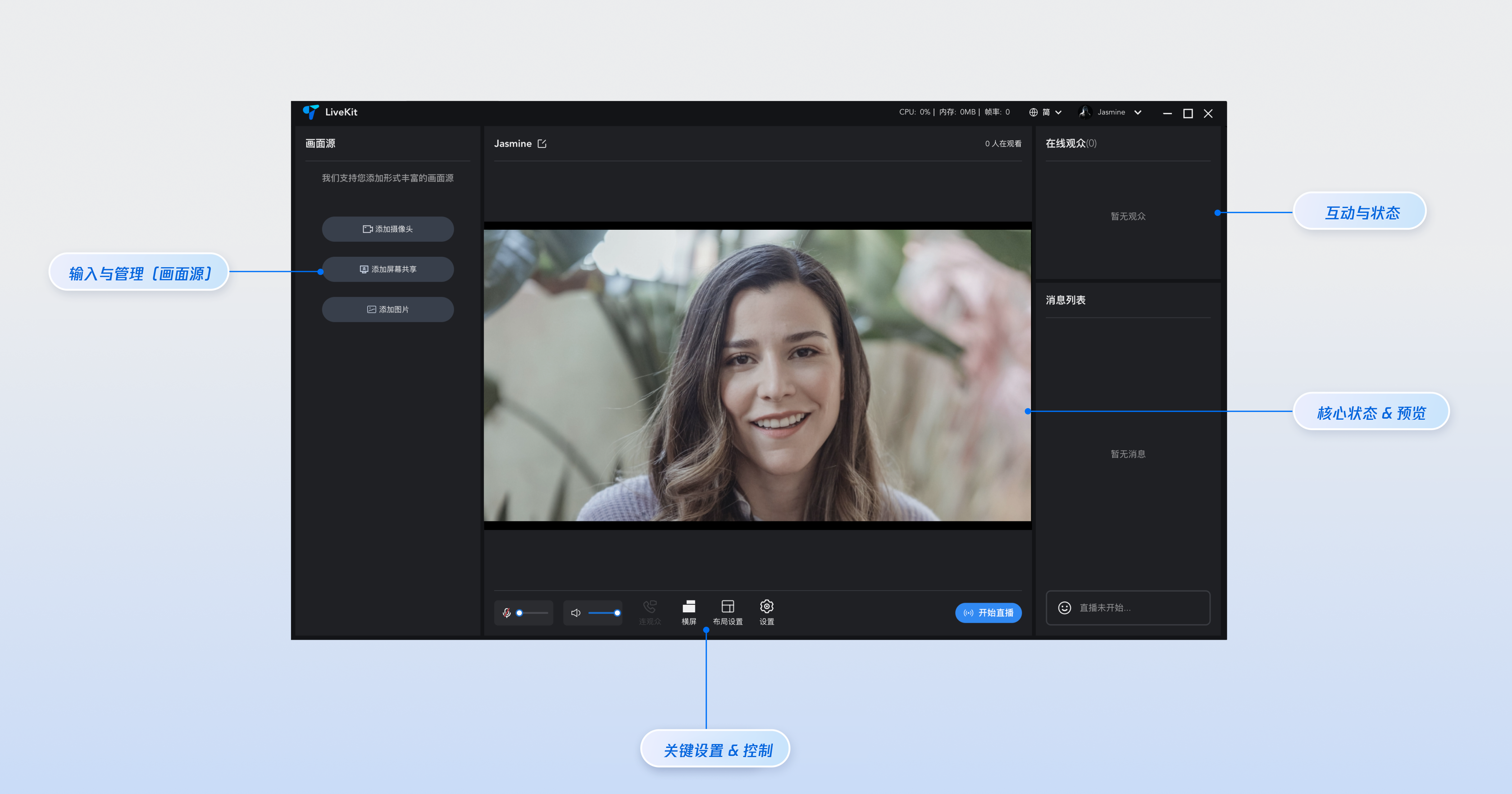 设备:摄像头、麦克风、扬声器。