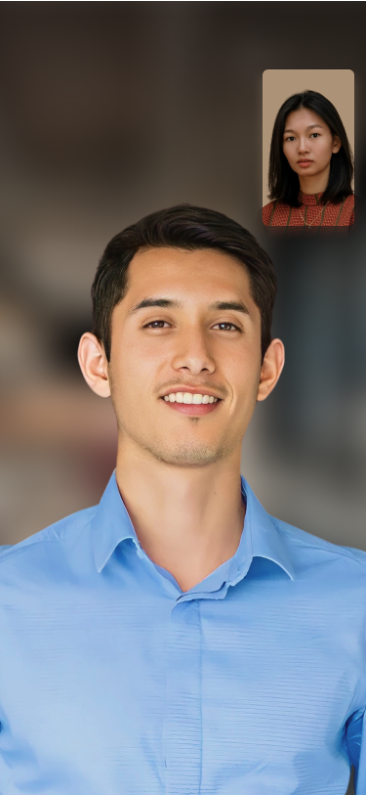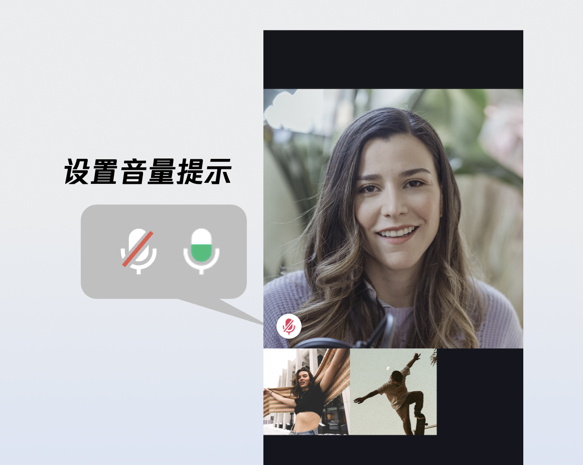 布局逻辑:呼叫等待时全屏显示己方画面;接通后全屏显示对方画面,己方画面以悬浮小窗展示。 交互特性:支持小窗拖拽移动,点击小窗可实现大小画面互换。 | 布局逻辑:所有成员画面呈网格状平铺排列成宫格模式布局,适用 2 人以上通话,支持点击放大画面功能。 交互特性:支持点击特定成员画面放大查看。 | 布局逻辑:1 v 1 场景固定显示对方画面,多人场景:采用当前发言者(Active Speaker) 策略,自动识别并全屏展示正在说话的用户。 交互特性:等待时显示自己的画面,接通后还会显示通话计时。 |